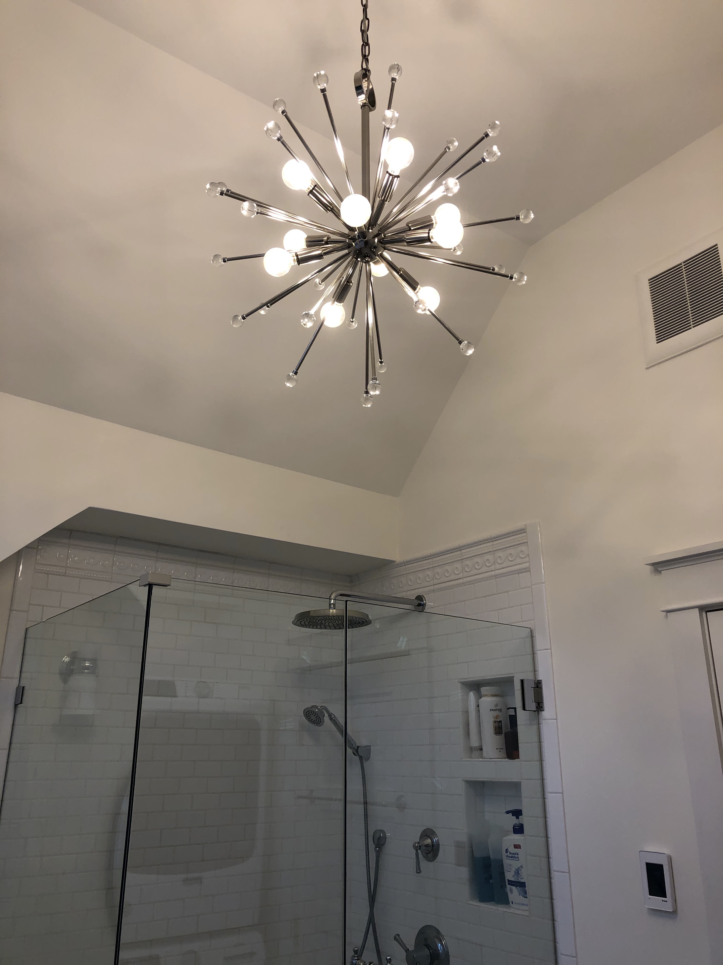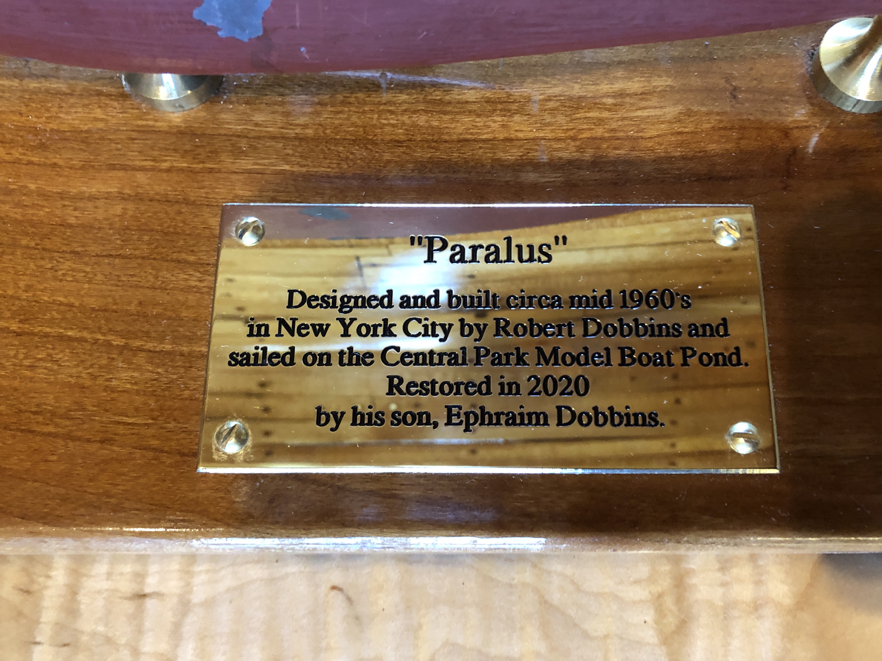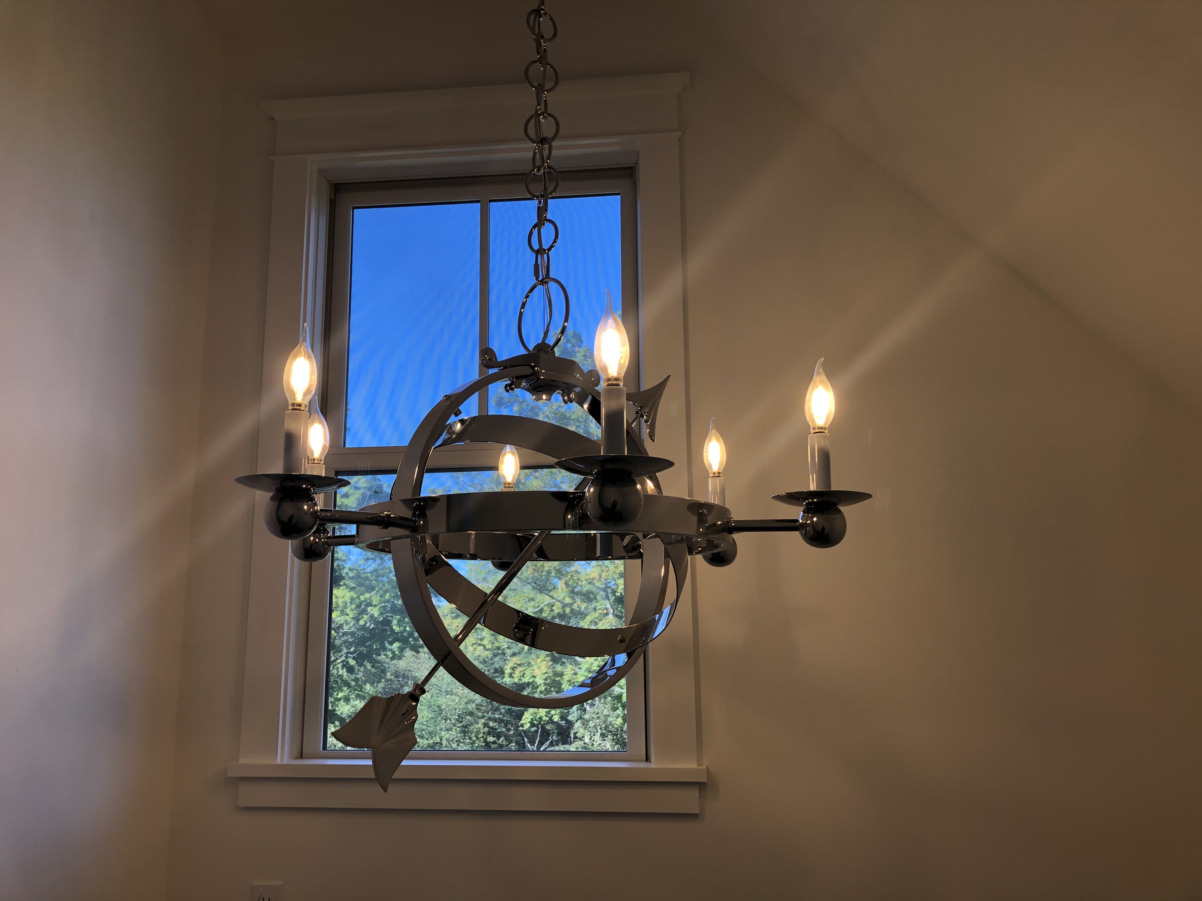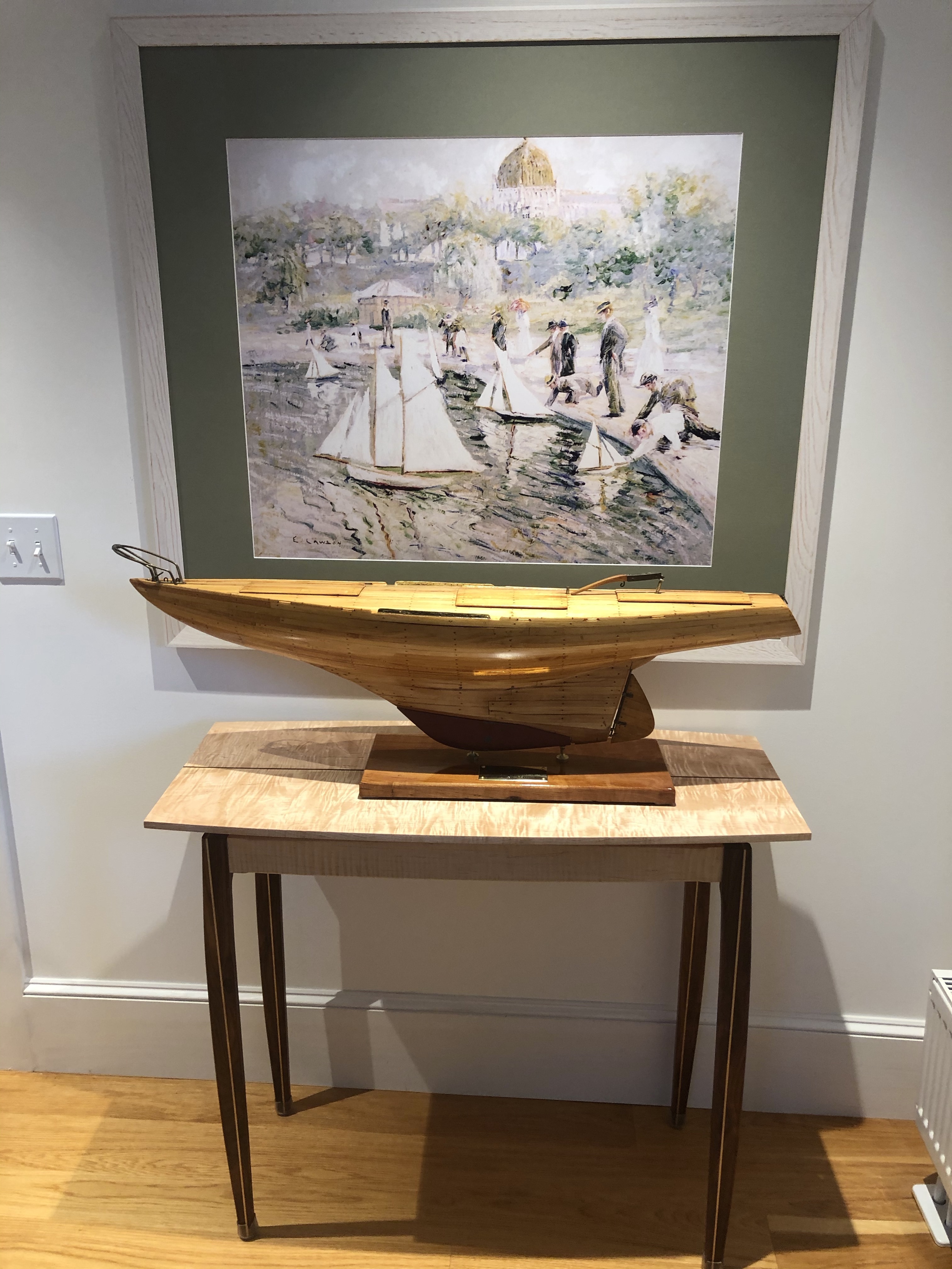 Restored family heirloom, "pond yacht", Paralus with print of Central Park model boat pond in the background, where it was sailed.Entryway chandelier. Evocative of an sundial, with the arrow pointing north.