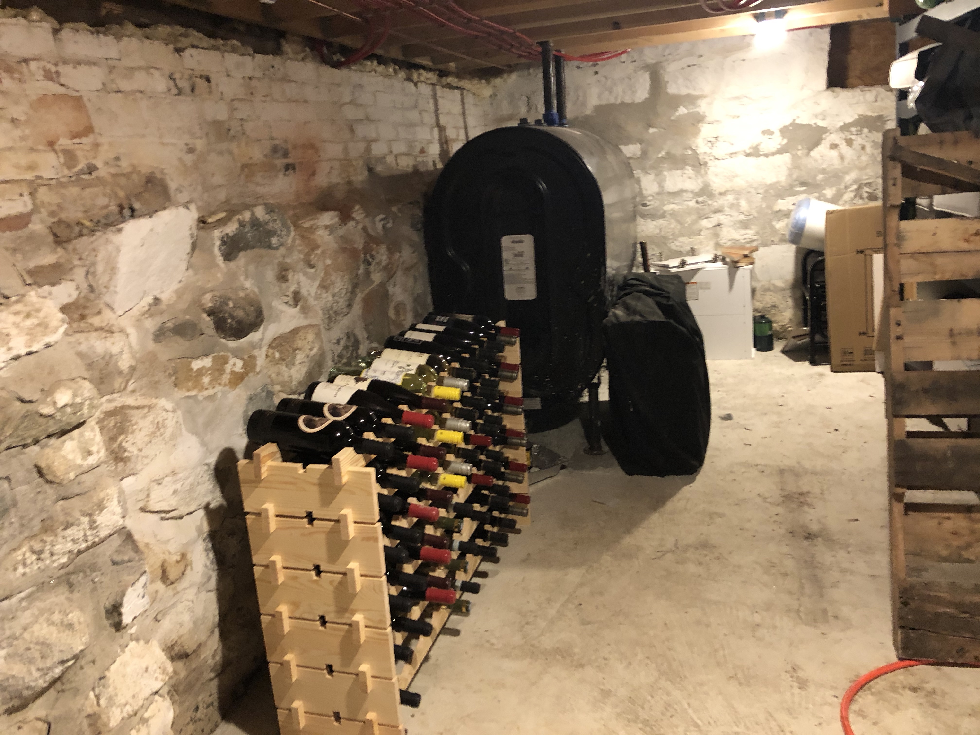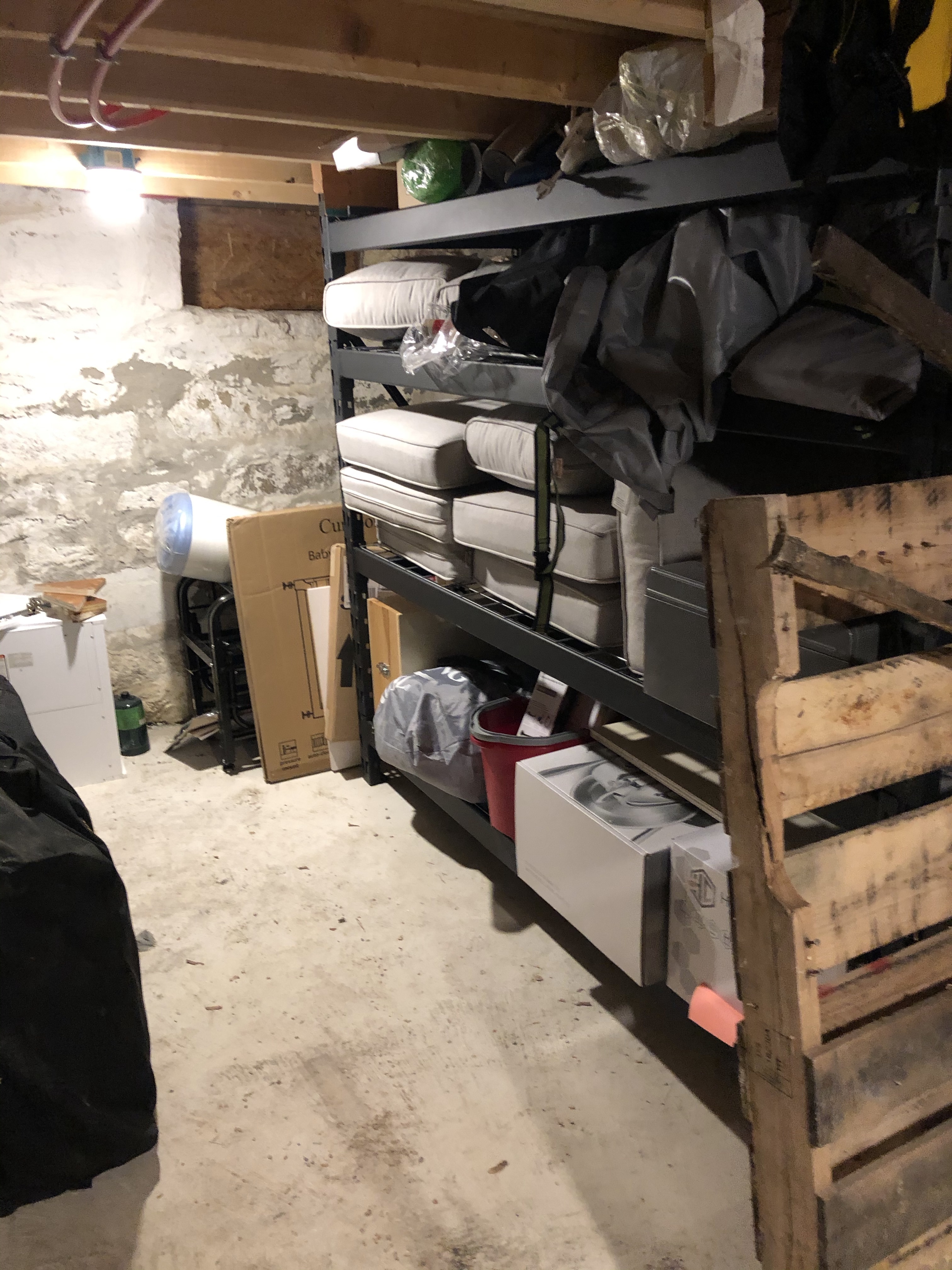 Essential provisions.Shelving with items not readily stored upstairs. Includes tool boxes, spare life jacket, some cook pots and other misc gear.