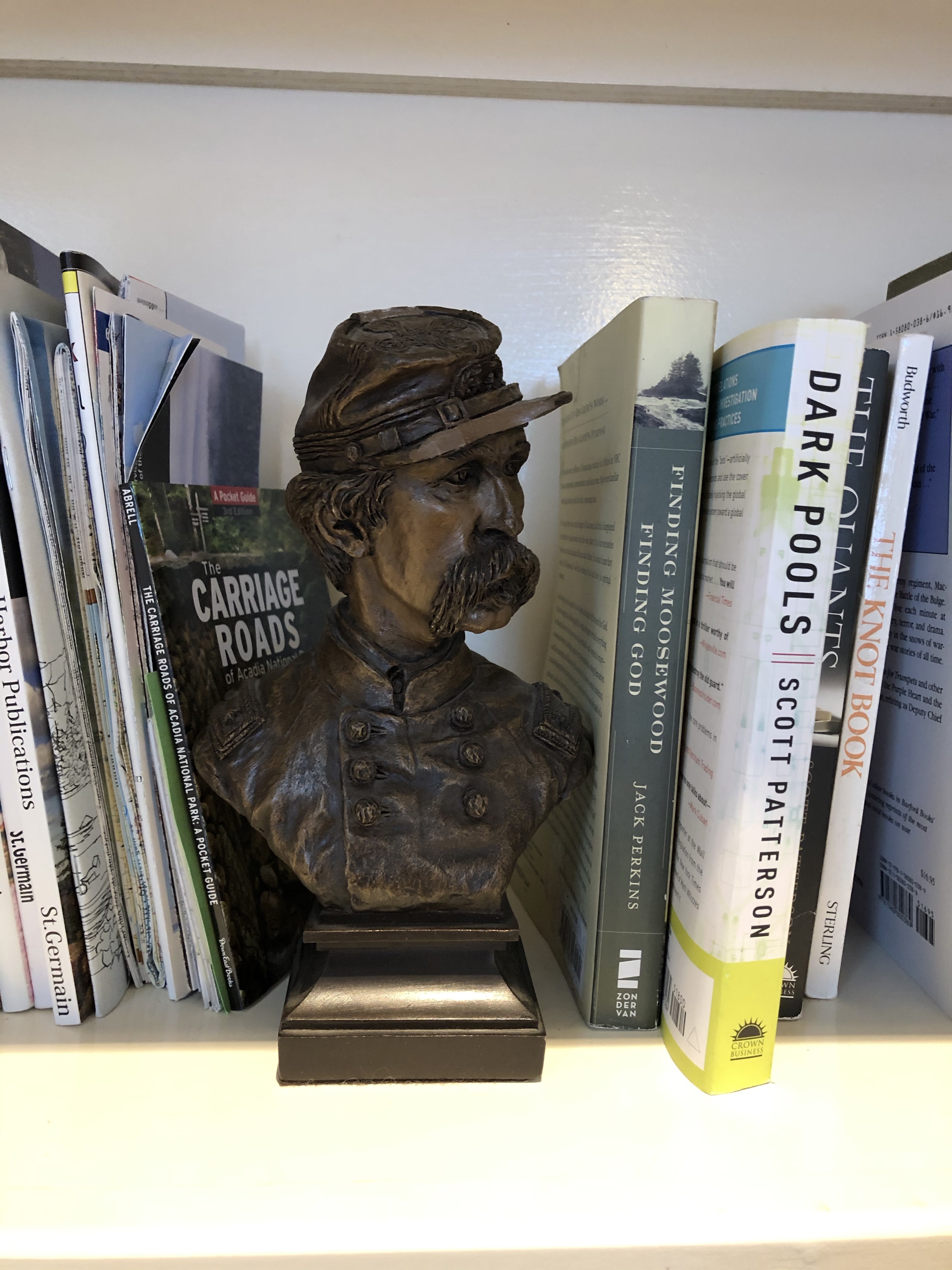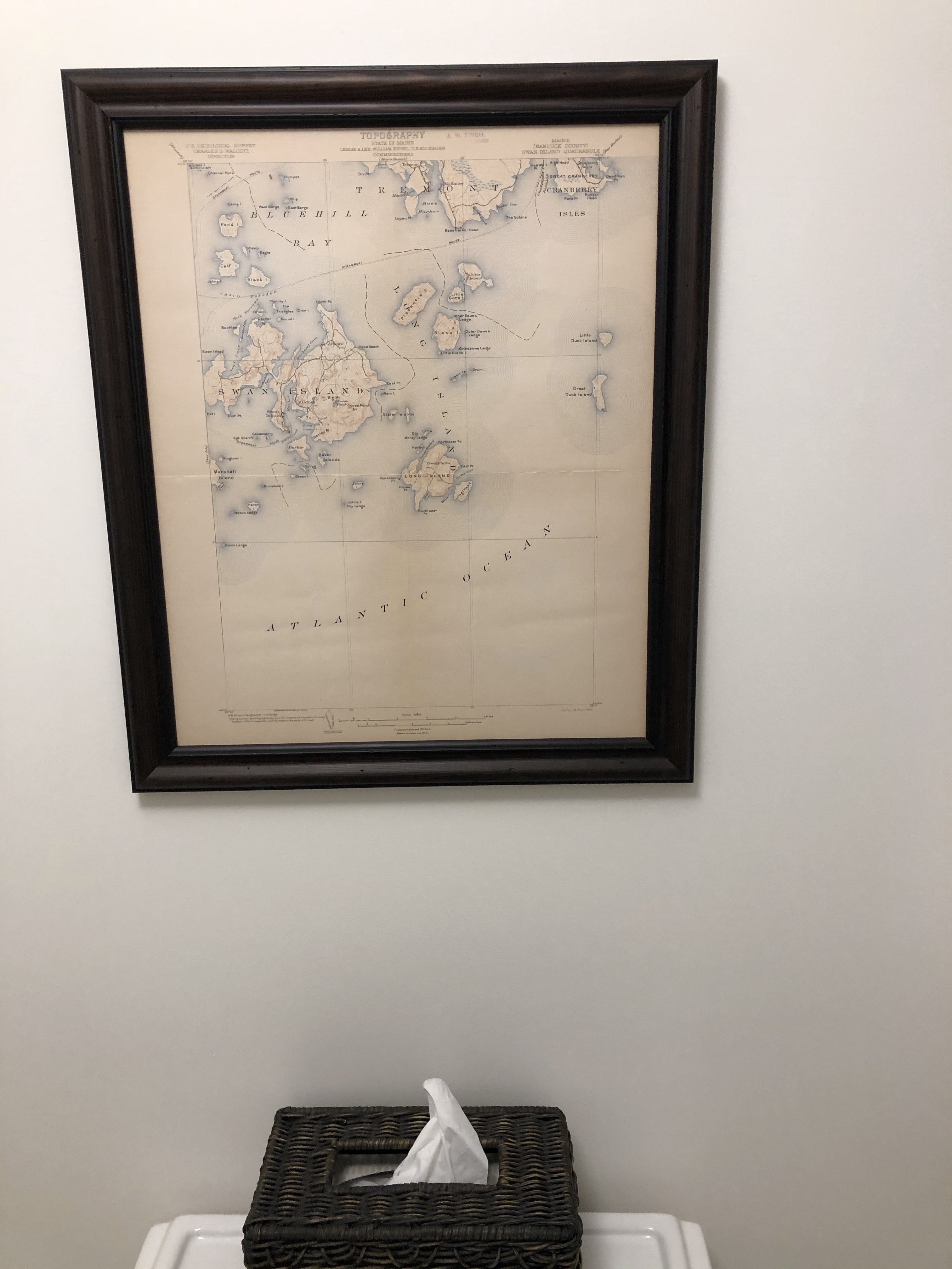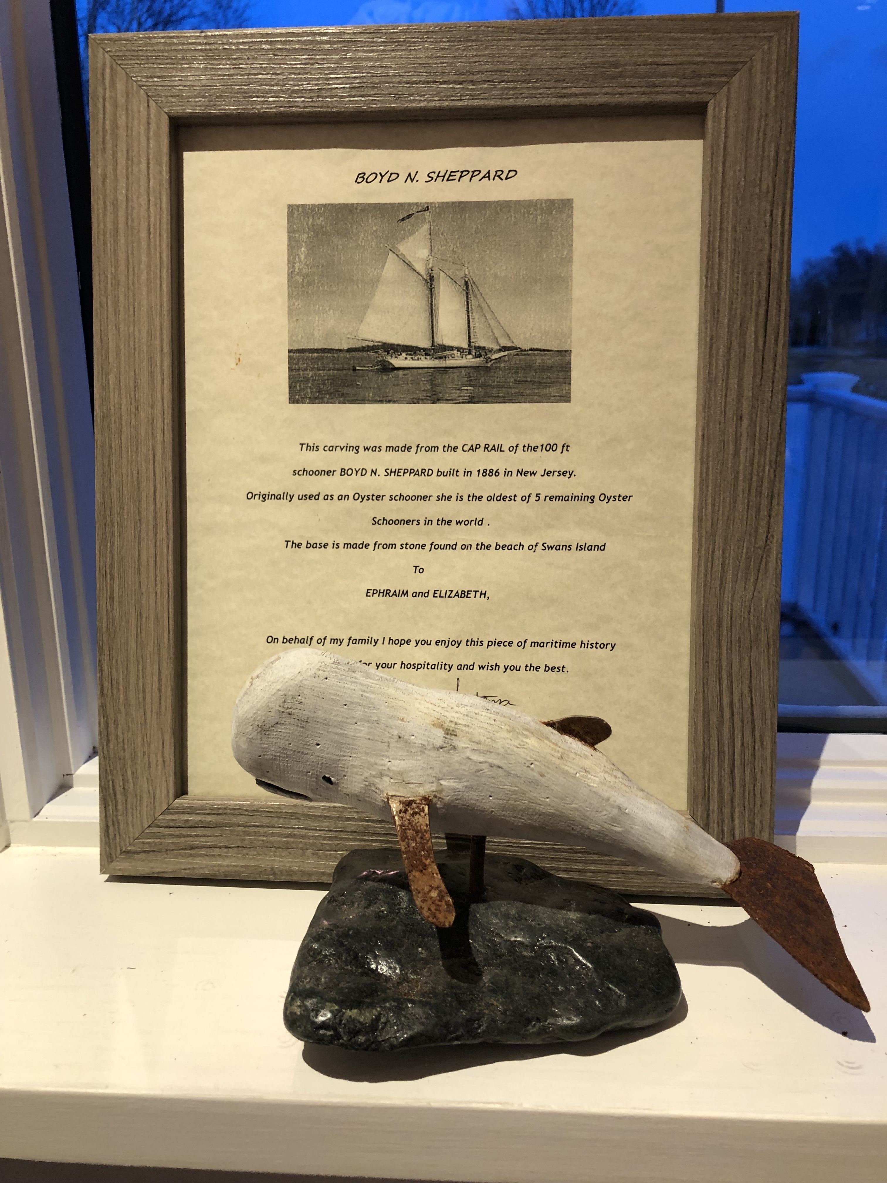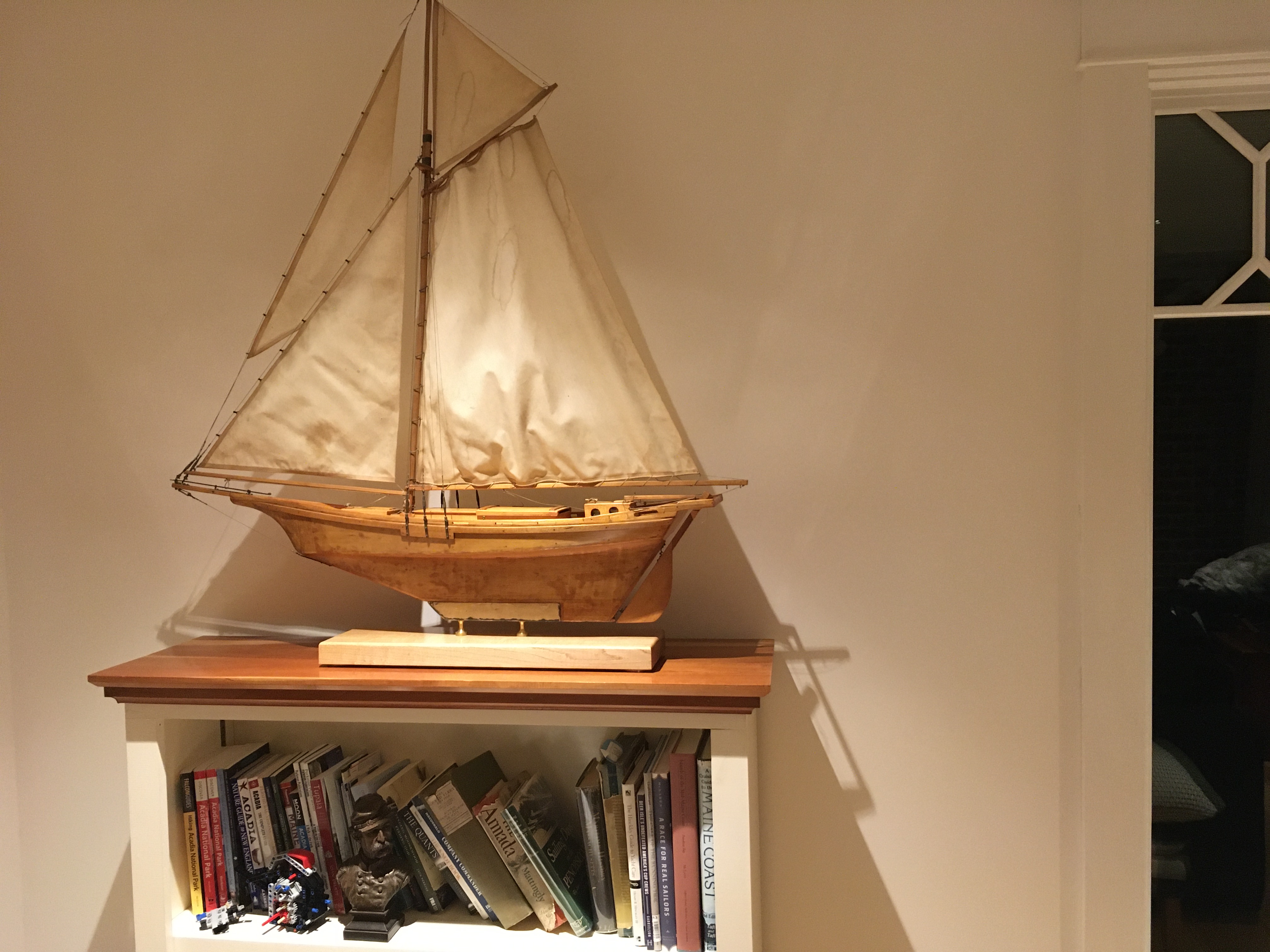 1904 topography map of Swan's Island.Mermaid by island artist Laurel Lemoine.Lumpfish glazed porcelain by local artist Christine Dentremont.Original watercolor of Swan's Island coastline.Whale carved by Jerry Sytsma from cap rail of schooner Boyd N. Sheppard with stone base from beach of Swan's Island.Shorebird carved fron beach wood by Jerry Sytsma, with stone base fron Swan's Island.Calligraphy "E" by local artist Laurel Lemoine.Bronze bust of Joshua Chamberlain, Colonel and commander of 20th Maine Regiment at the battle of Gettysburg, Governor of Maine (1866-70).1/700 scale model of British battleship Prince of Wales, December 1941.Wooden model of a Hudson river sloop built as a child by Ephraim Dobbins, circa 1970, and sailed in the Central Park boat pond.Original lithograph of Mt. Desert Rock. Wooden toy tug boat made by Robert Dobbins, circa mid 1960's.