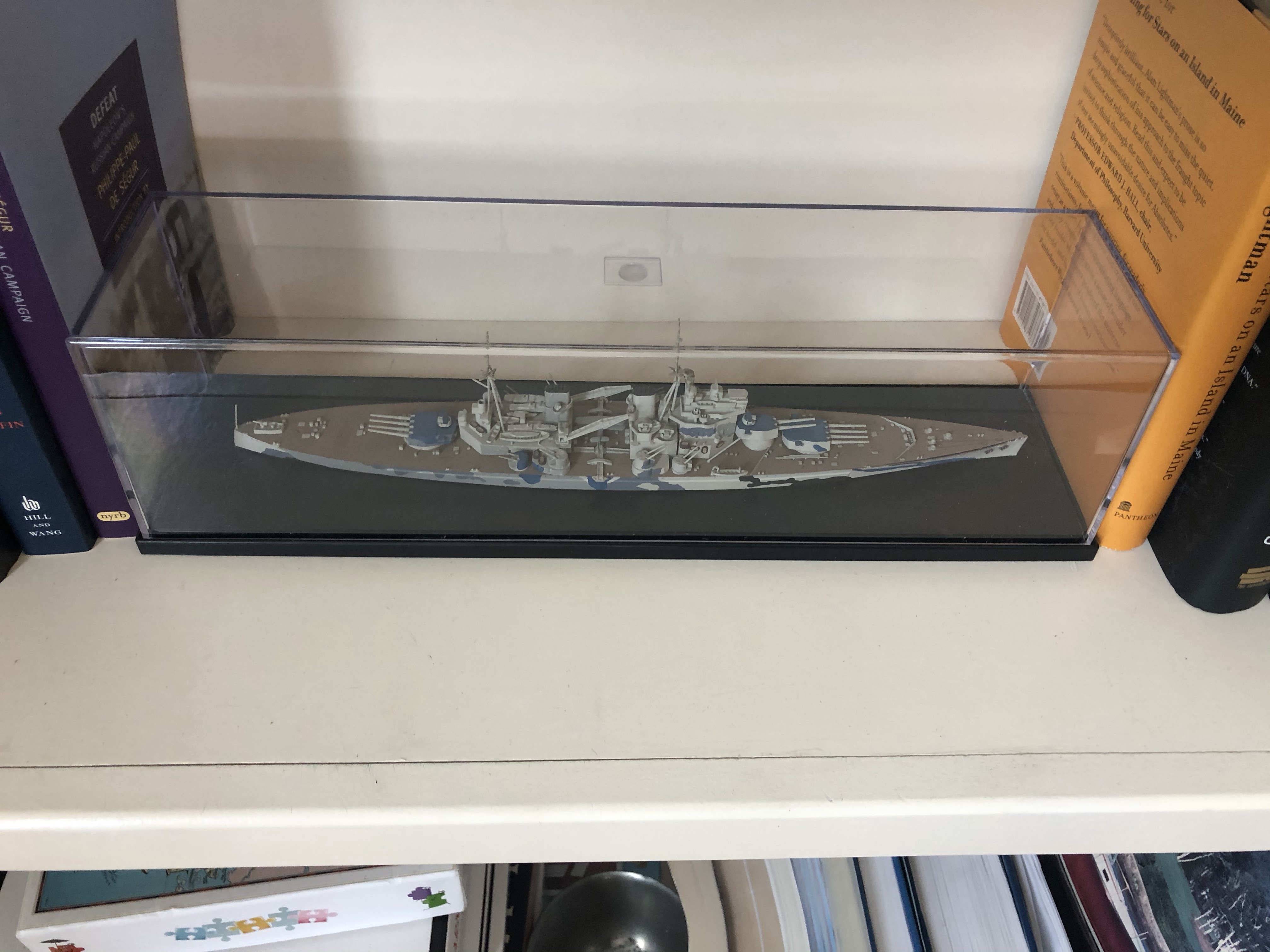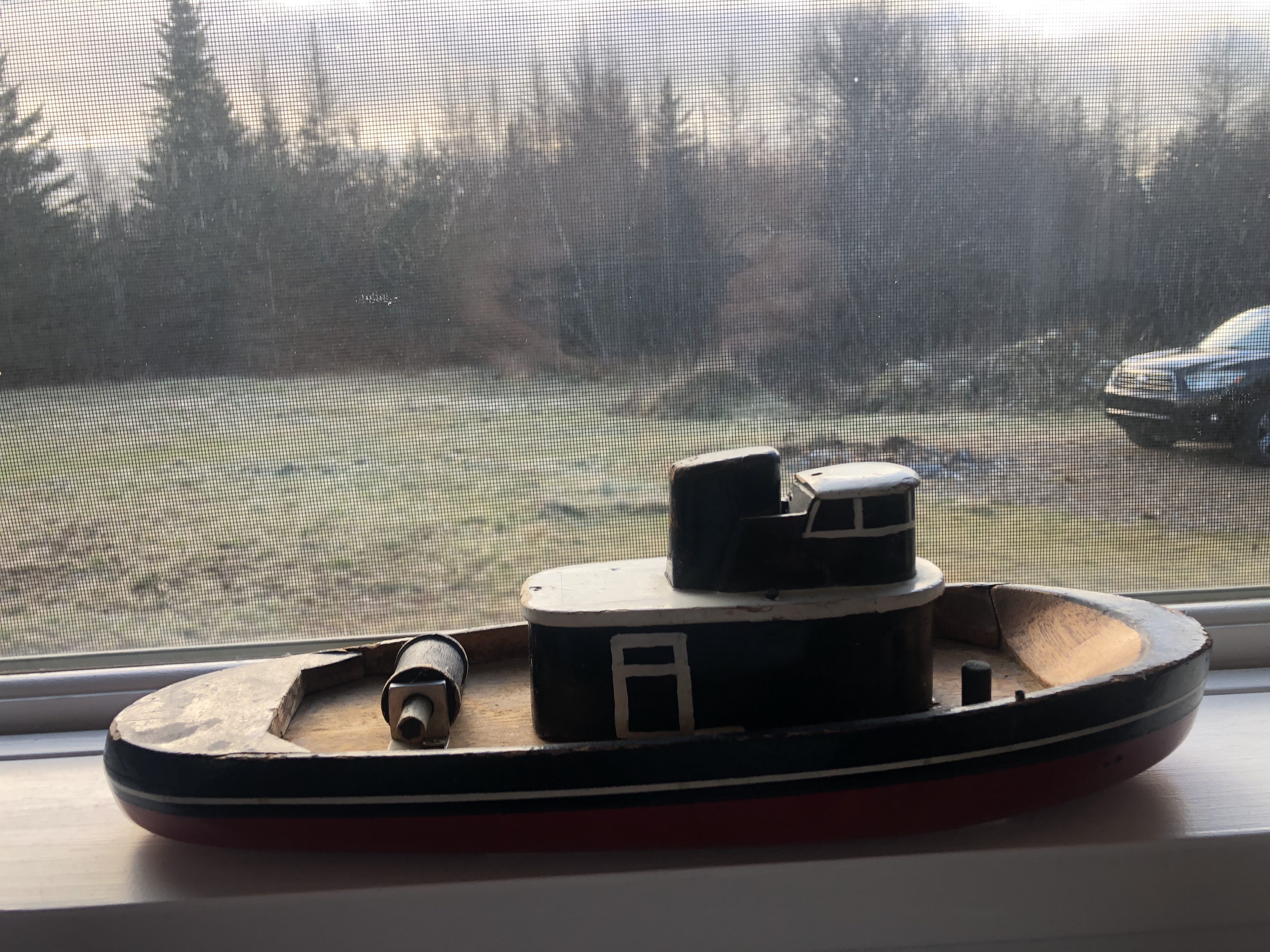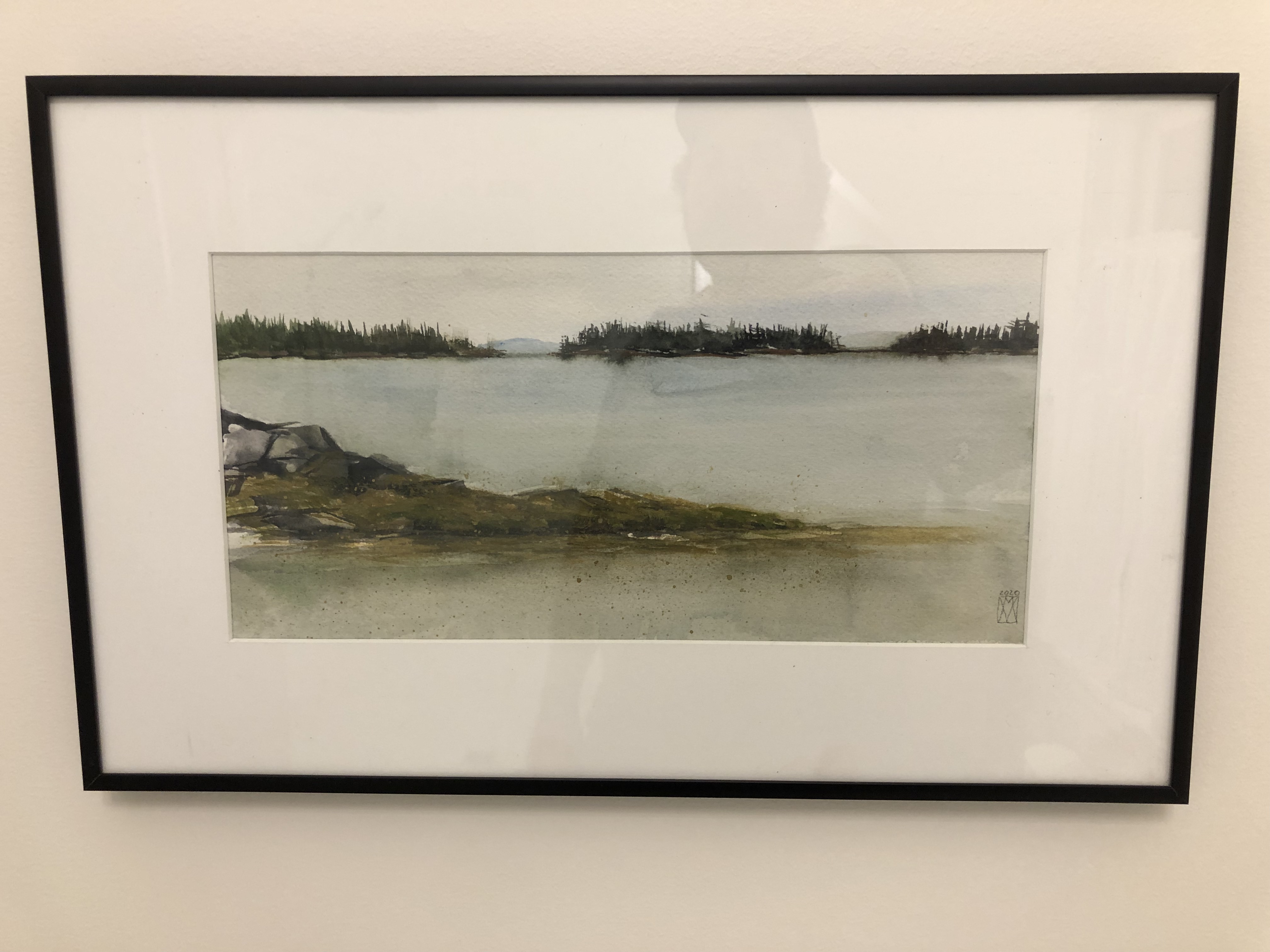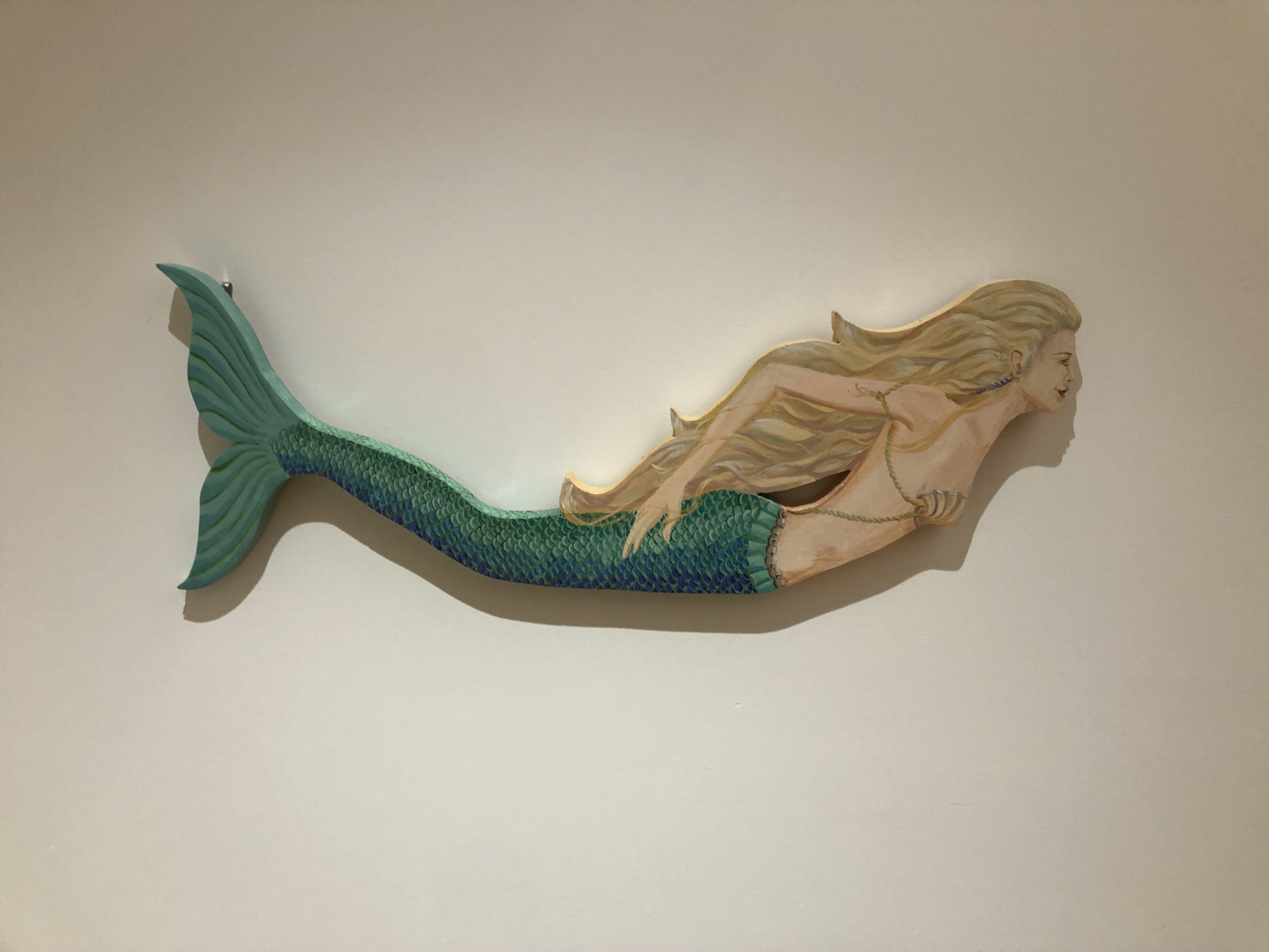1904 topography map of Swan's Island.Mermaid by island artist Laurel Lemoine.Lumpfish glazed porcelain by local artist Christine Dentremont.Original watercolor of Swan's Island coastline.Whale carved by Jerry Sytsma from cap rail of schooner Boyd N. Sheppard with stone base from beach of Swan's Island.Shorebird carved fron beach wood by Jerry Sytsma, with stone base fron Swan's Island.Calligraphy "E" by local artist Laurel Lemoine.Bronze bust of Joshua Chamberlain, Colonel and commander of 20th Maine Regiment at the battle of Gettysburg, Governor of Maine (1866-70).1/700 scale model of British battleship Prince of Wales, December 1941.Wooden model of a Hudson river sloop built as a child by Ephraim Dobbins, circa 1970, and sailed in the Central Park boat pond.Original lithograph of Mt. Desert Rock. Wooden toy tug boat made by Robert Dobbins, circa mid 1960's.