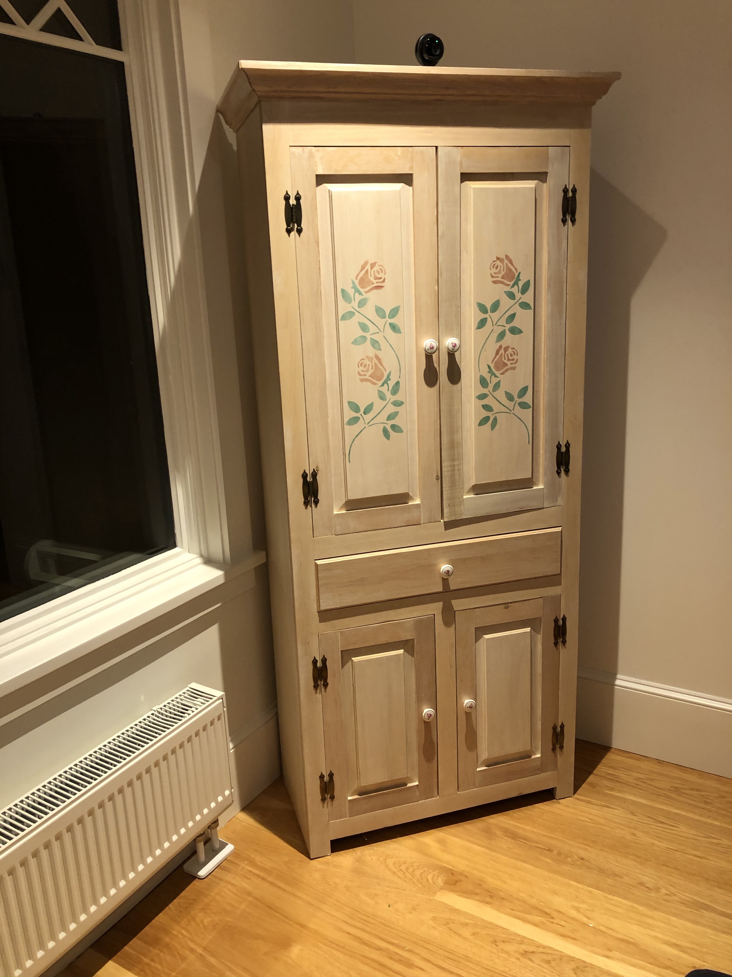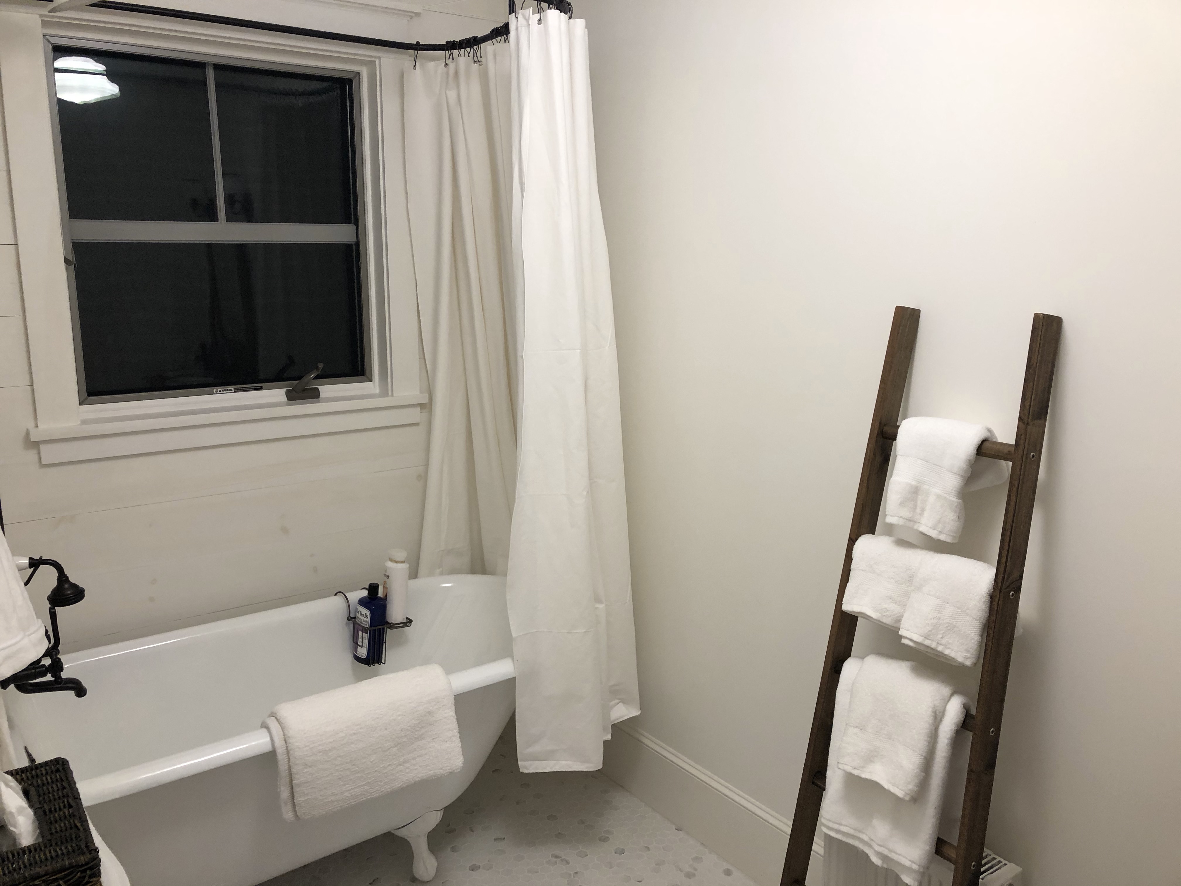 Panoramic view of bathroom showing tub, sink and layout.Tub and towel "ladder".Sink base made from quasi-antique bureau.