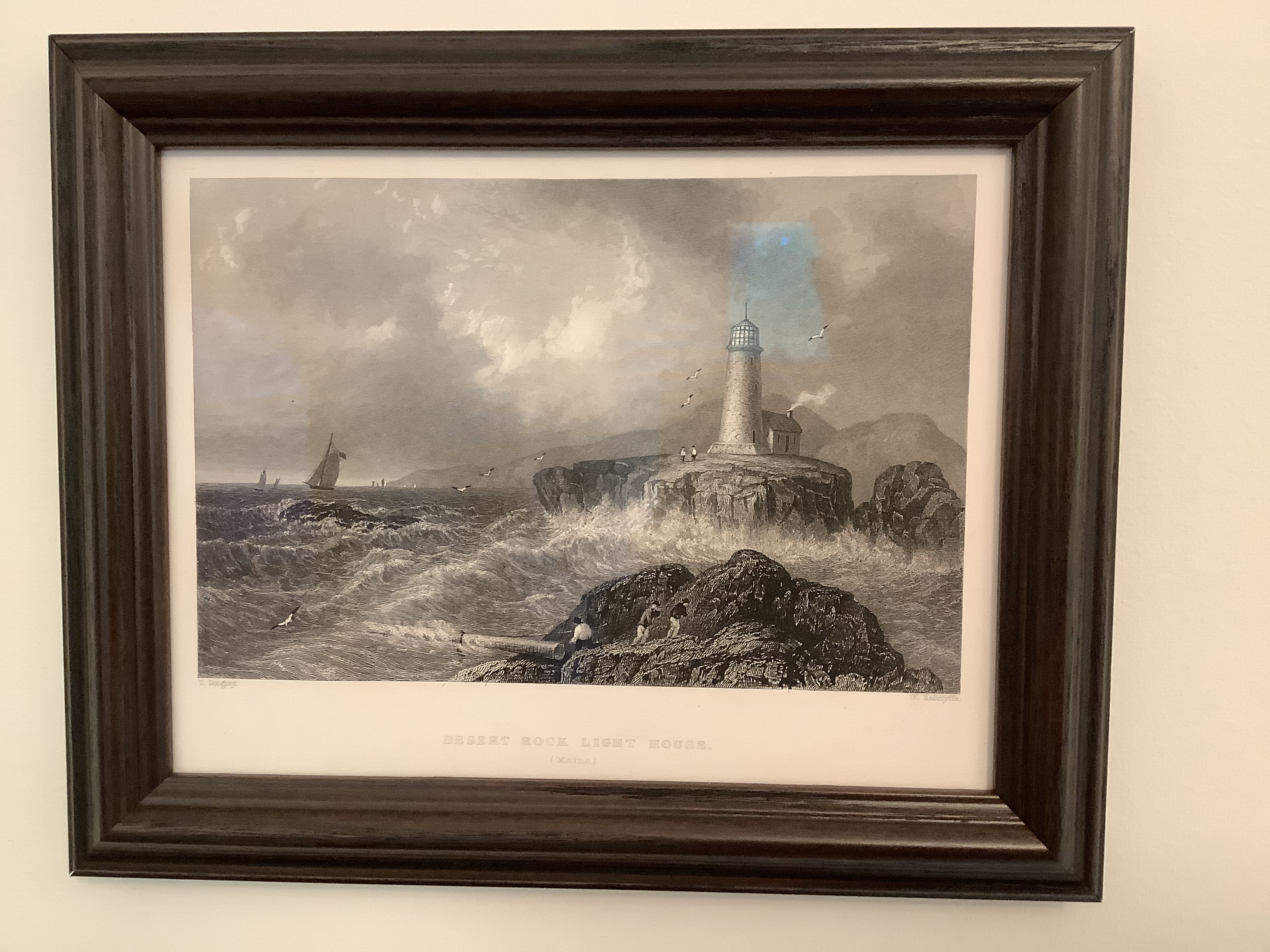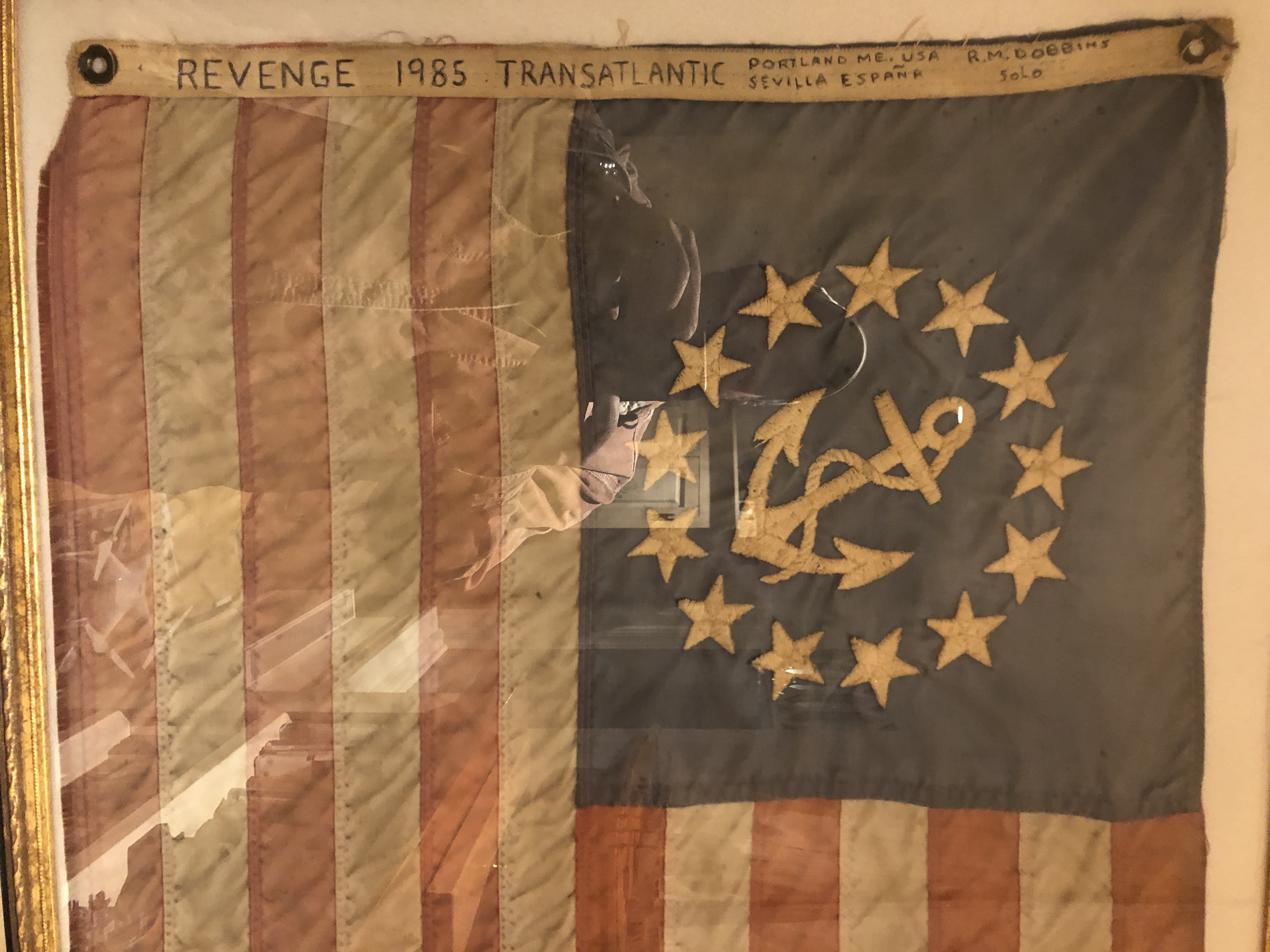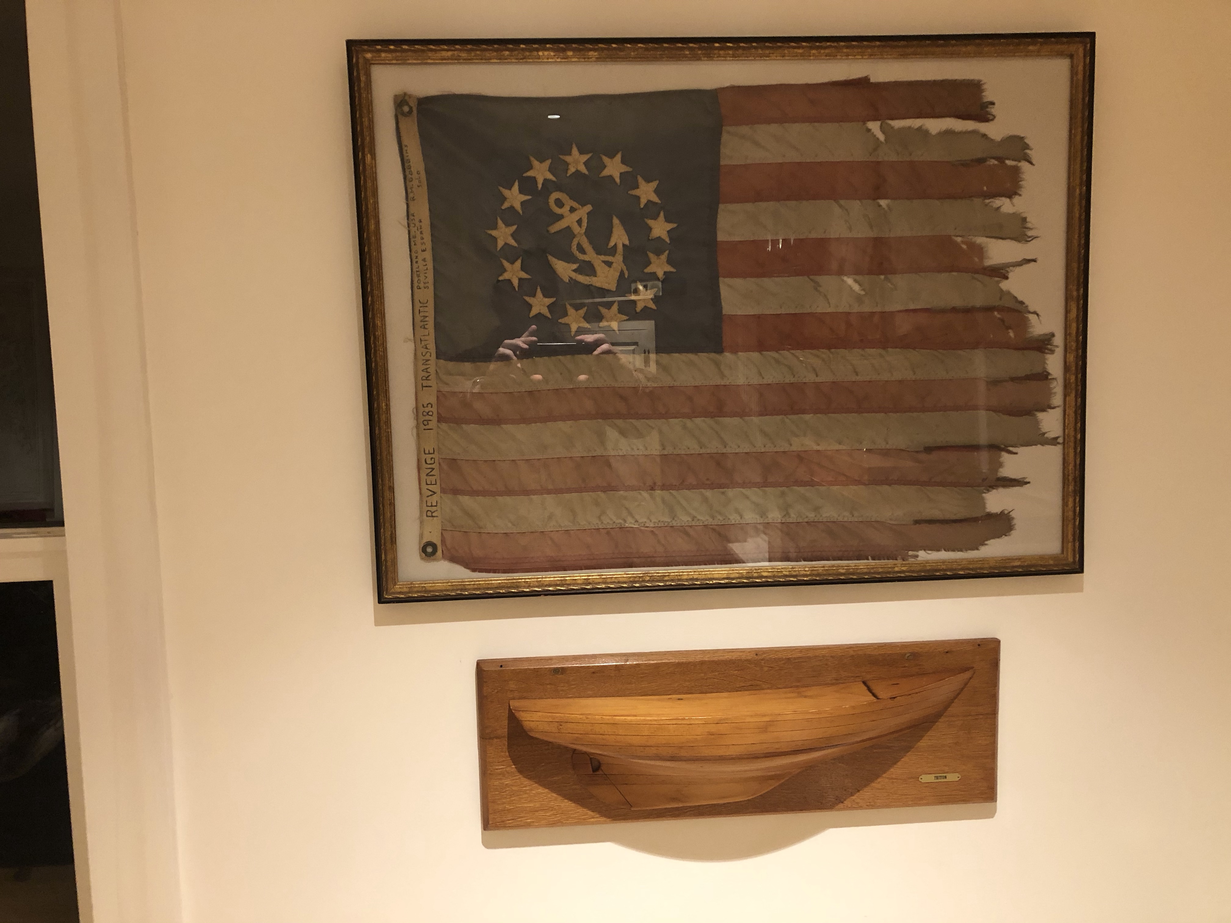 Painting on left is original oil by Nathan Ward of the Cloud House. The painting on the right is an original oil of Port Clyde waterfront from Somesville gallery. An original oil painting of Schoodic Point by Mary Jo Carew. Painting on left is original oil by Nathan Ward of the Cloud House. The painting on the right is an original oil of Port Clyde waterfront from Somesville gallery. Flag flown from Robert Dobbins' sloop Revenge, a 28' sailboat, on his transatlantic voyage in 1985. Half model is of the same boat.More reference than art, This is a nautical map of the area surrounding Swan's Island and an excellent starting point for contempating off island destinations.