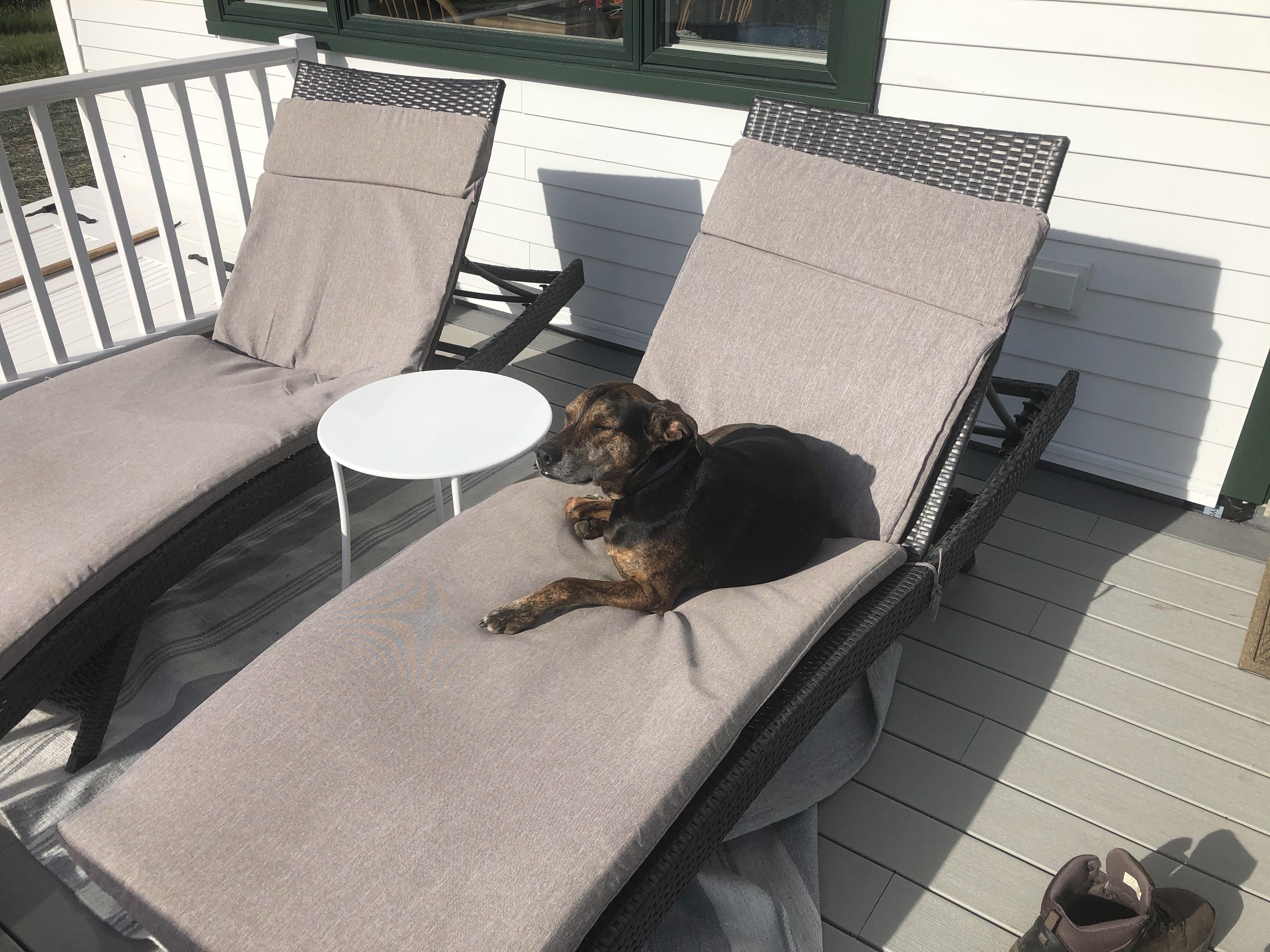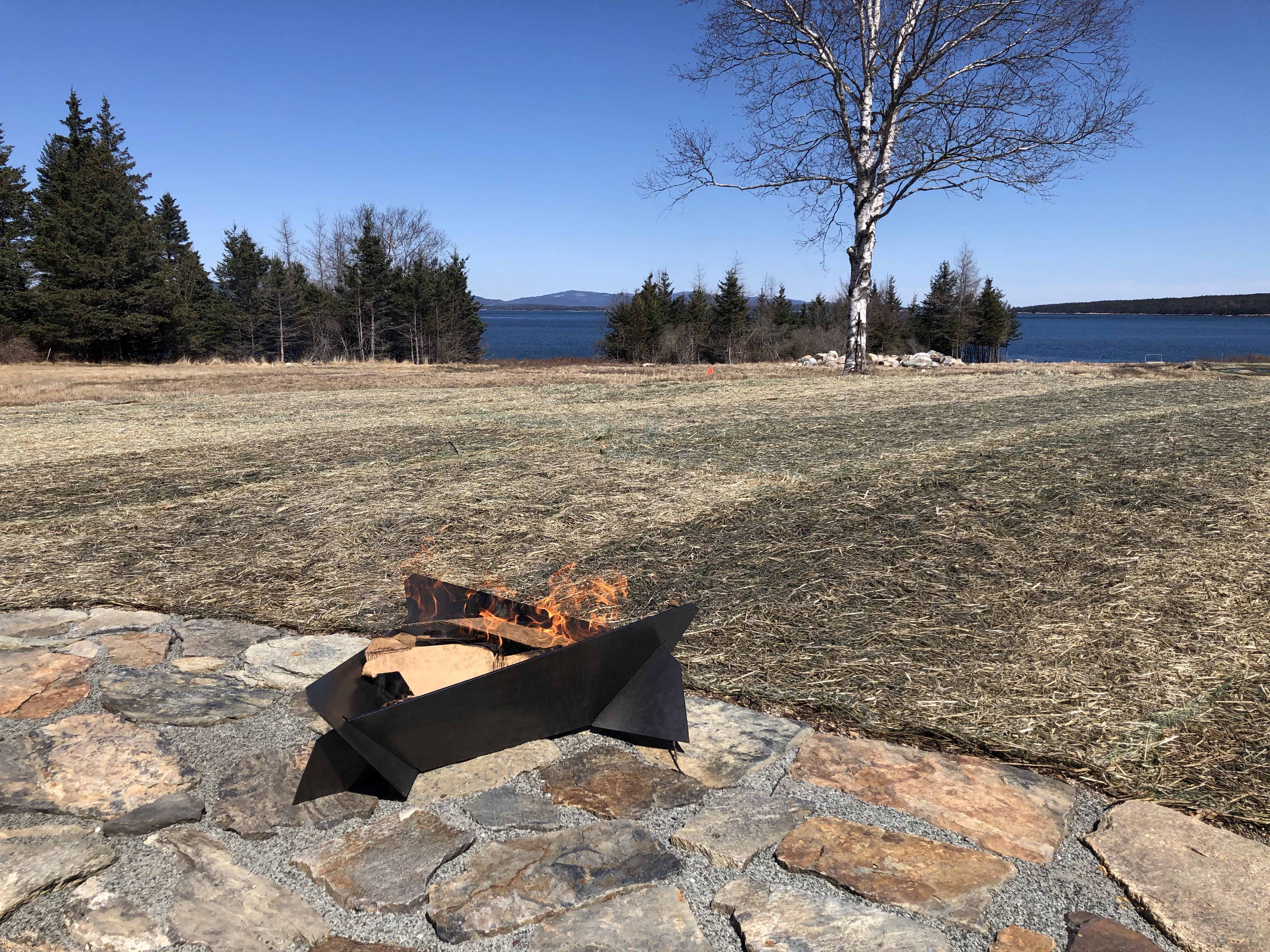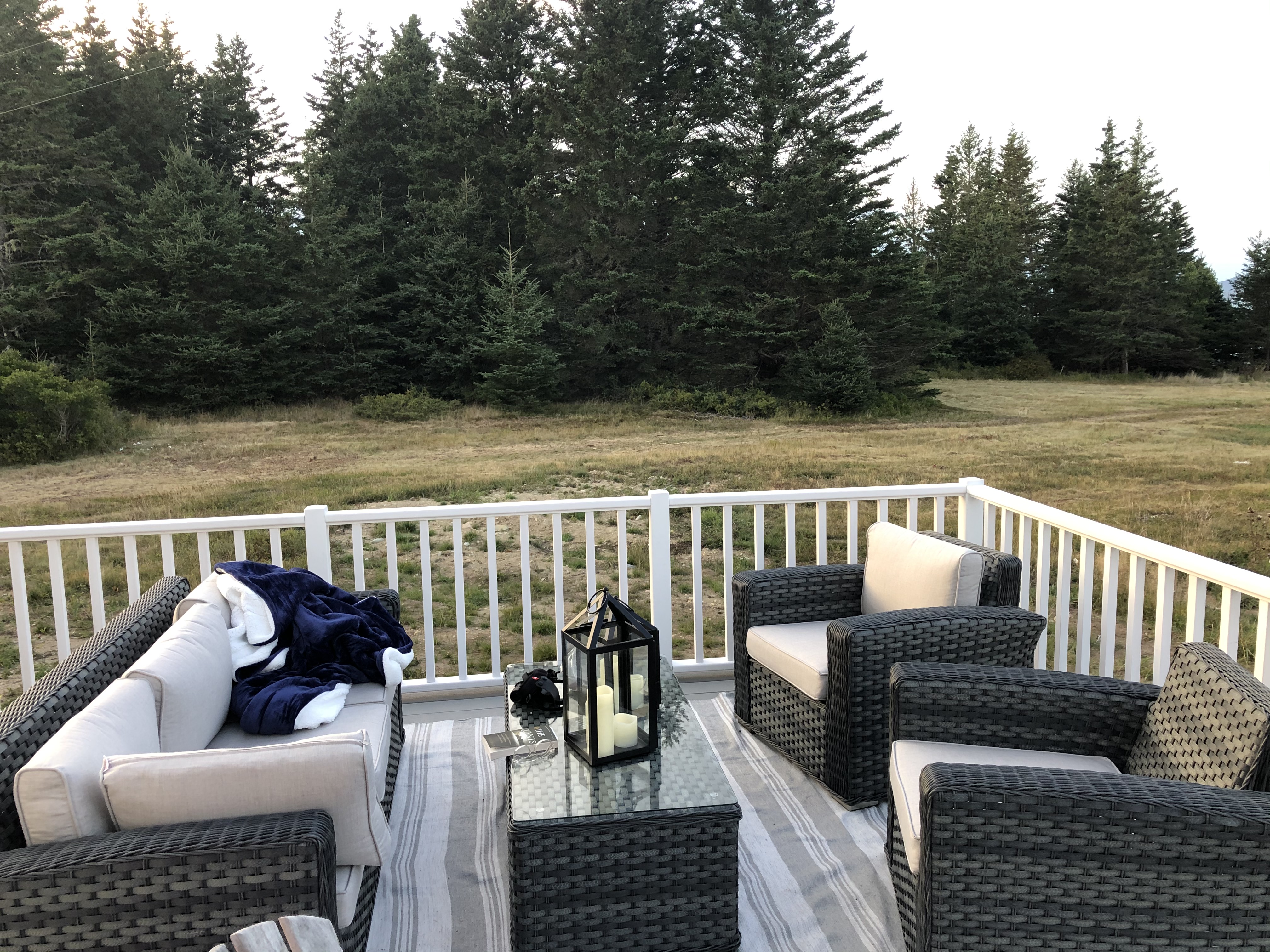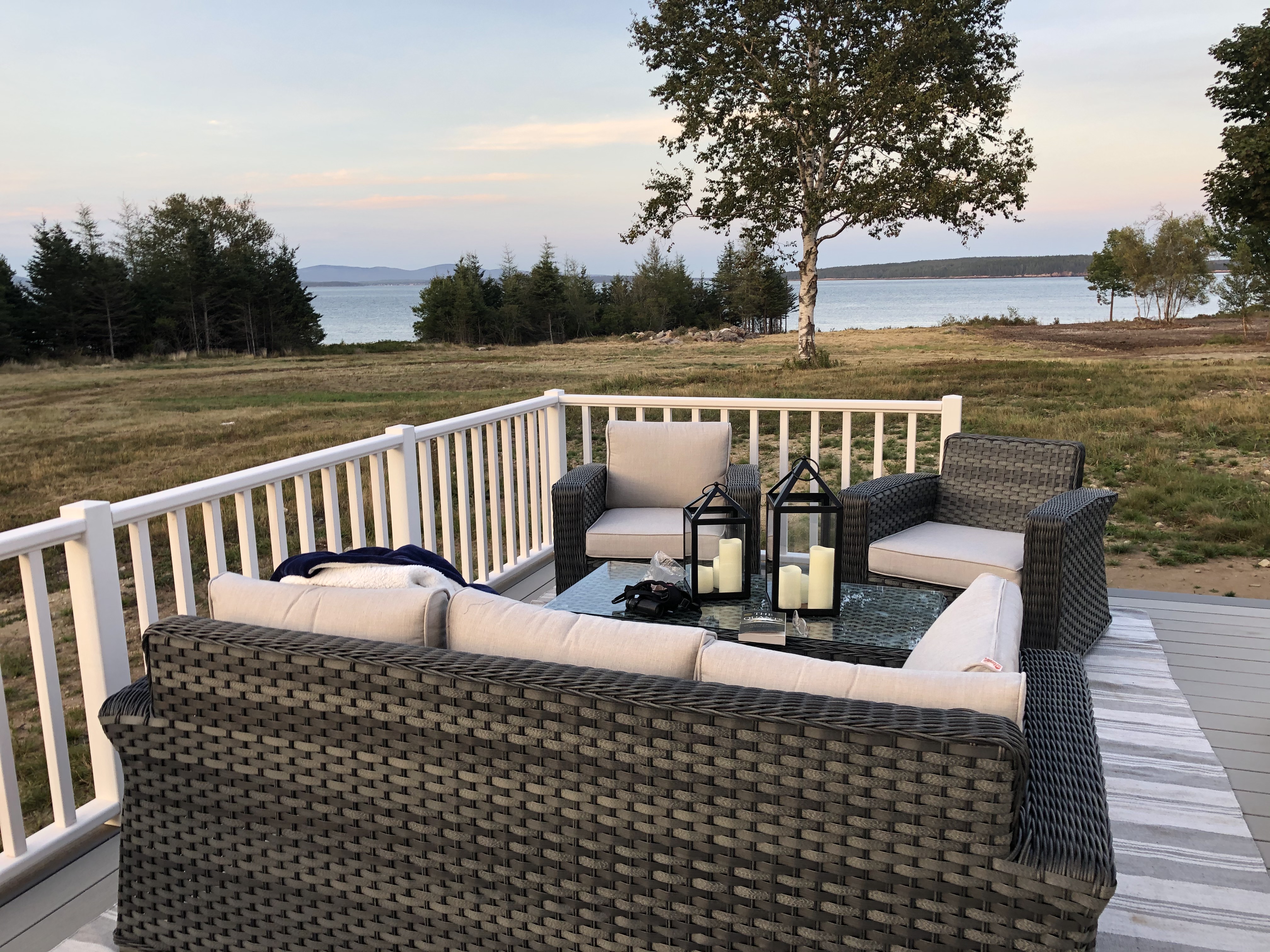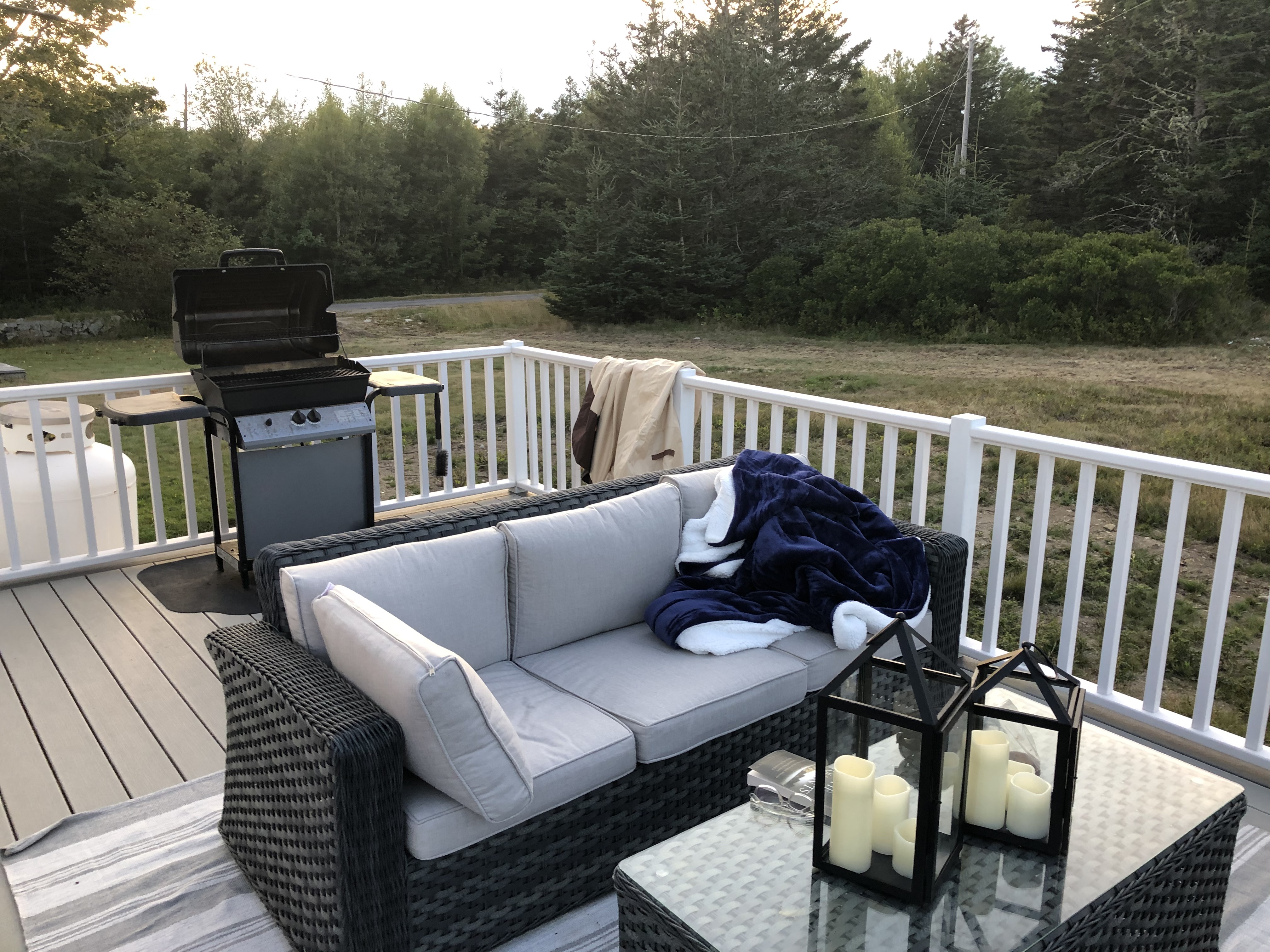 View of the Eastern Passage from back of the deck.Grill on west side of deck.Seating area with comfy sofa, chairs and table.Lounge chairs on south side of deck, modeled by Brayden.Fire pit made from four pieces of plate steel, interlocked together.