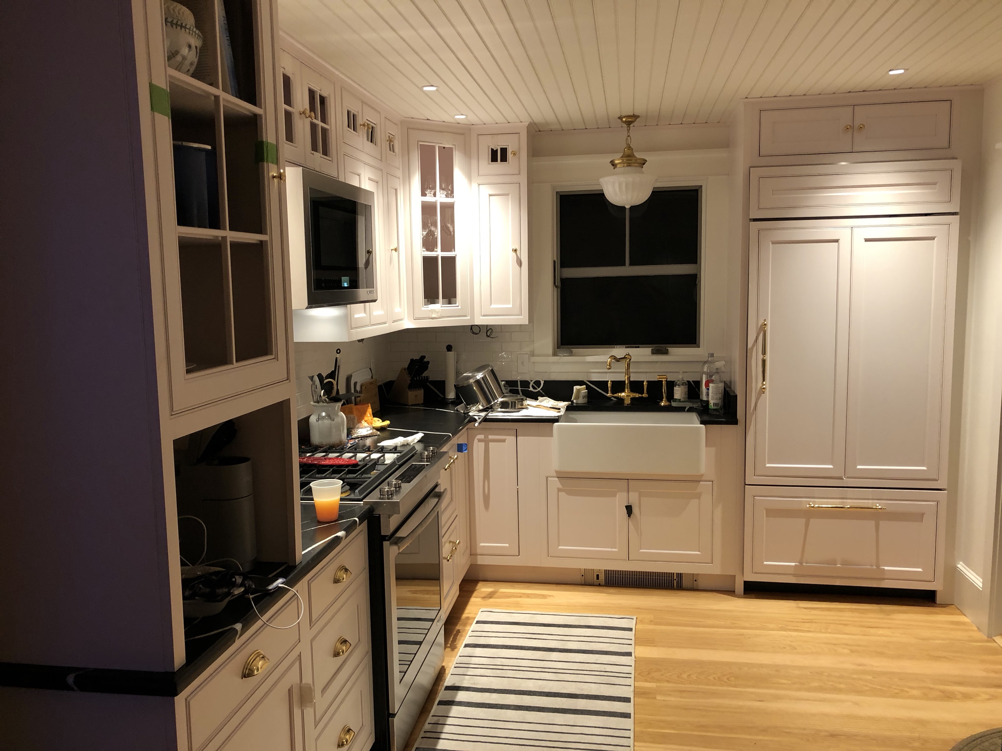 Cabinets, counters, range, dishwashing drawers and sink all in and functional.Updated view with microwave installed and panels on refrigerator and dishwasher drawers.