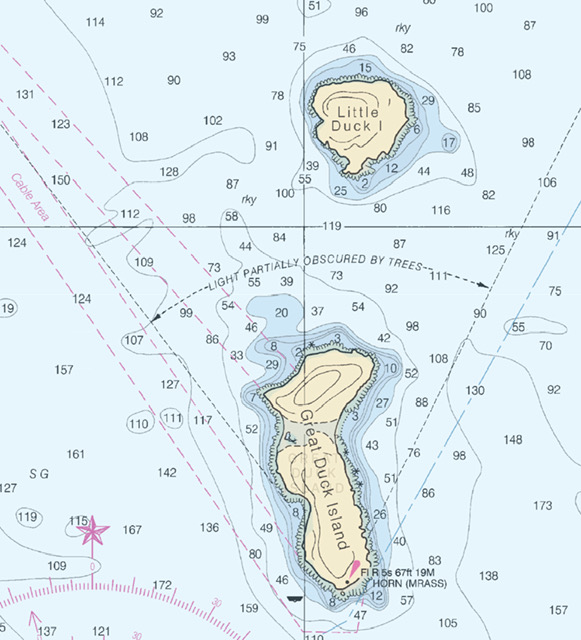 A bit to the west of Swan's Island, a sizable island that is partially Acadia park land, with good hiking on over 20 miles of trails. A narrow channel separates Isle au Haut from Kimball Island providing a great view of the harbors on each end. The lighthouse at Robinson point provides a scenic backdrop as well