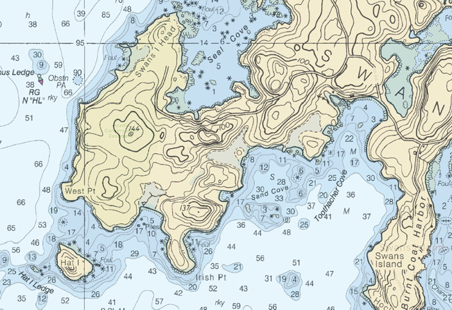 These two islands lie just a couple of miles north of Mackeral Cove and offer a nice beach set up for the day. Sheep Island has a wide beach which has great views out to Blue Hill Bay and the boats transiting the Casco Passage. Black island is adjacent to Sheep Island with a small beach and slightly limited views. This is made up for by the rocks providing a diving platform (at high tide only) and a more favorable anchoring situation.
