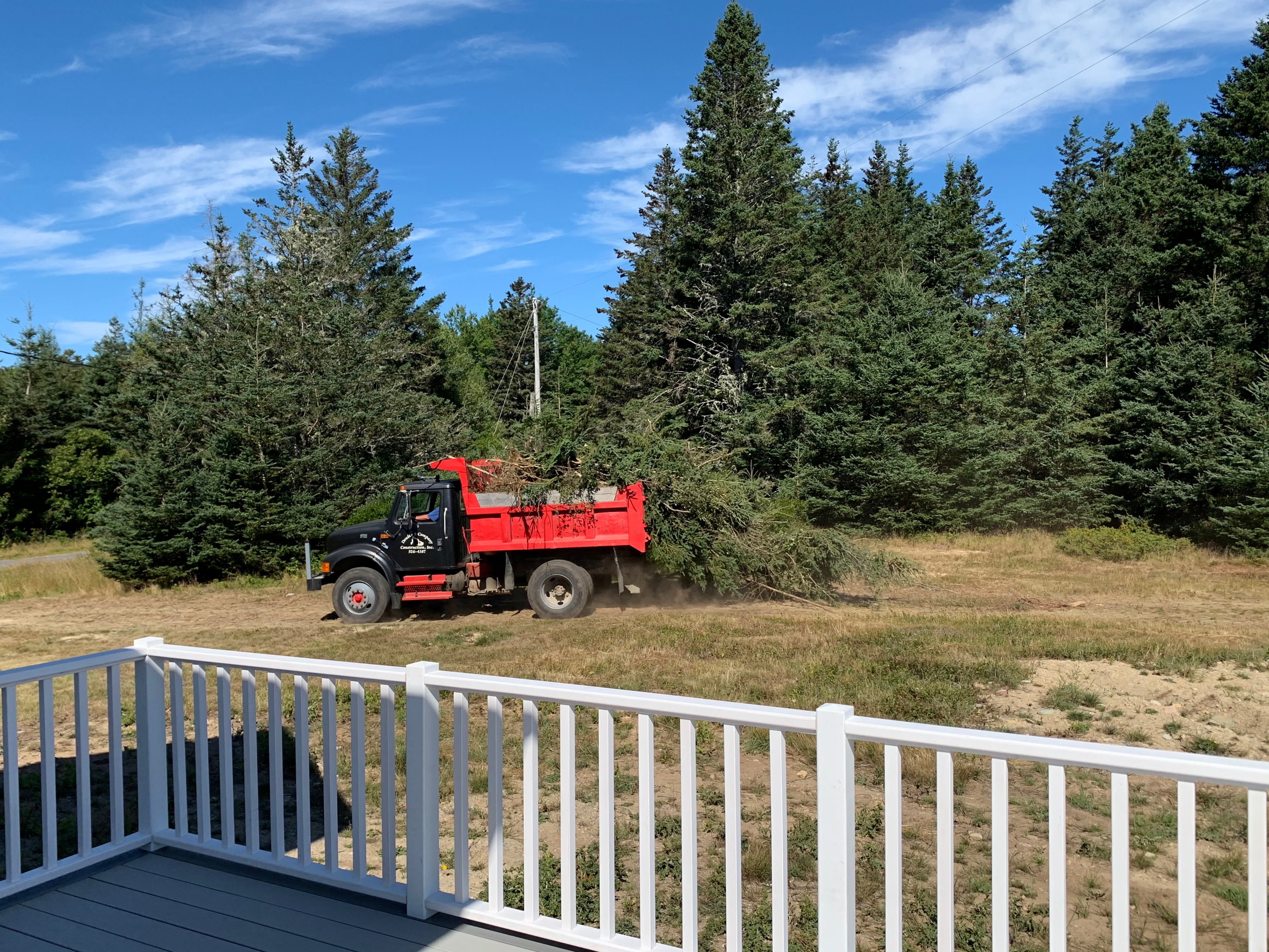 Clearing out spruce trees, leaving hardwoods.Hauling out the spruces.View to the water with grading done.View back to house with grading done.Pulling stumps and moving boulders. The wonders of hydraulics!Finished laying drain pipe from corner of basement to low spot in side woods. No need for sump pump now!Driveway renewal.Post clearing view in JuneBrush burningBrush chippingTrees coming down!Scorched earth clearing.View of Acadia mountainsView from deck, prominent birch treeAlong the "beach"