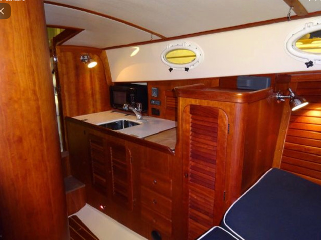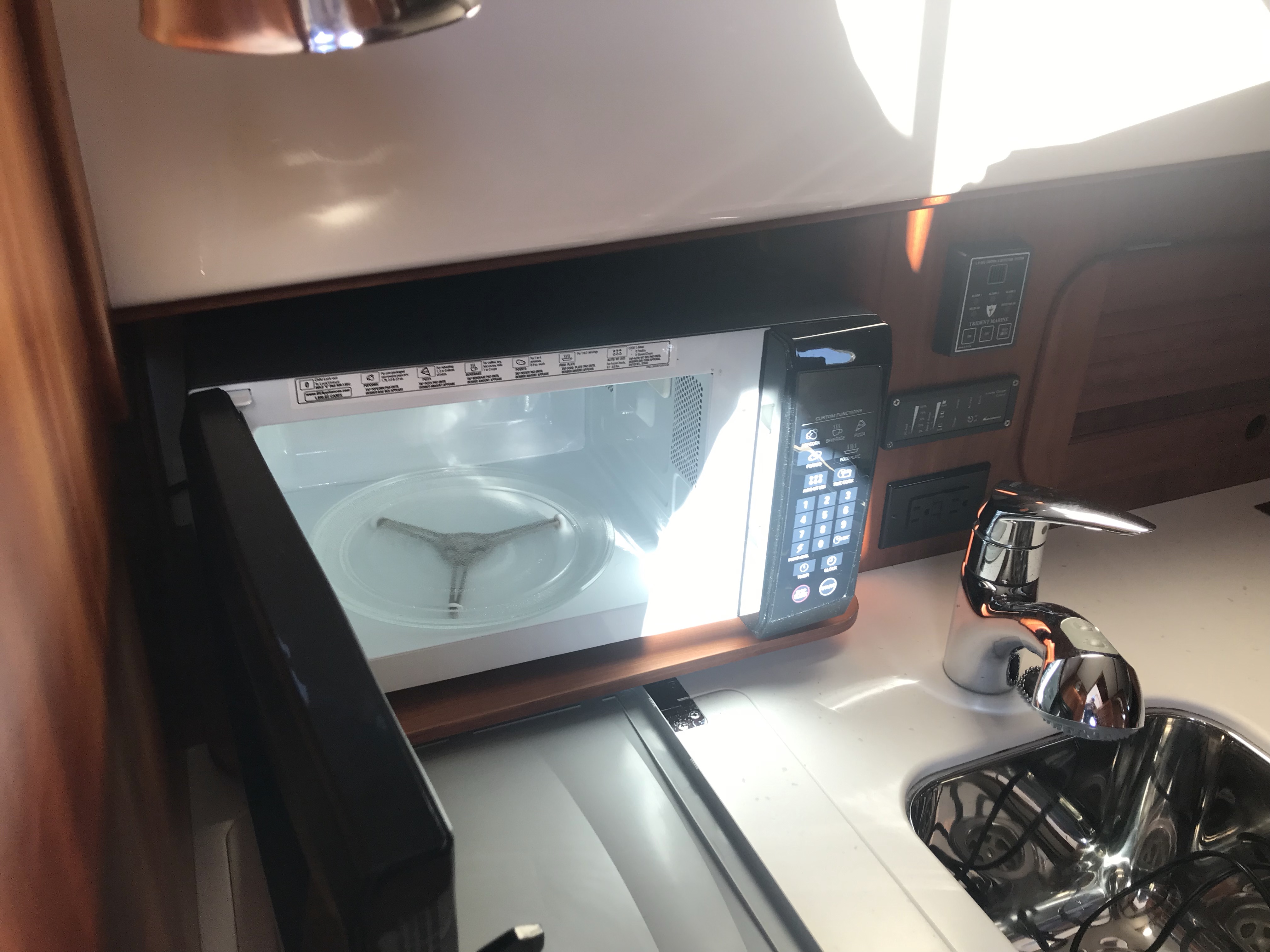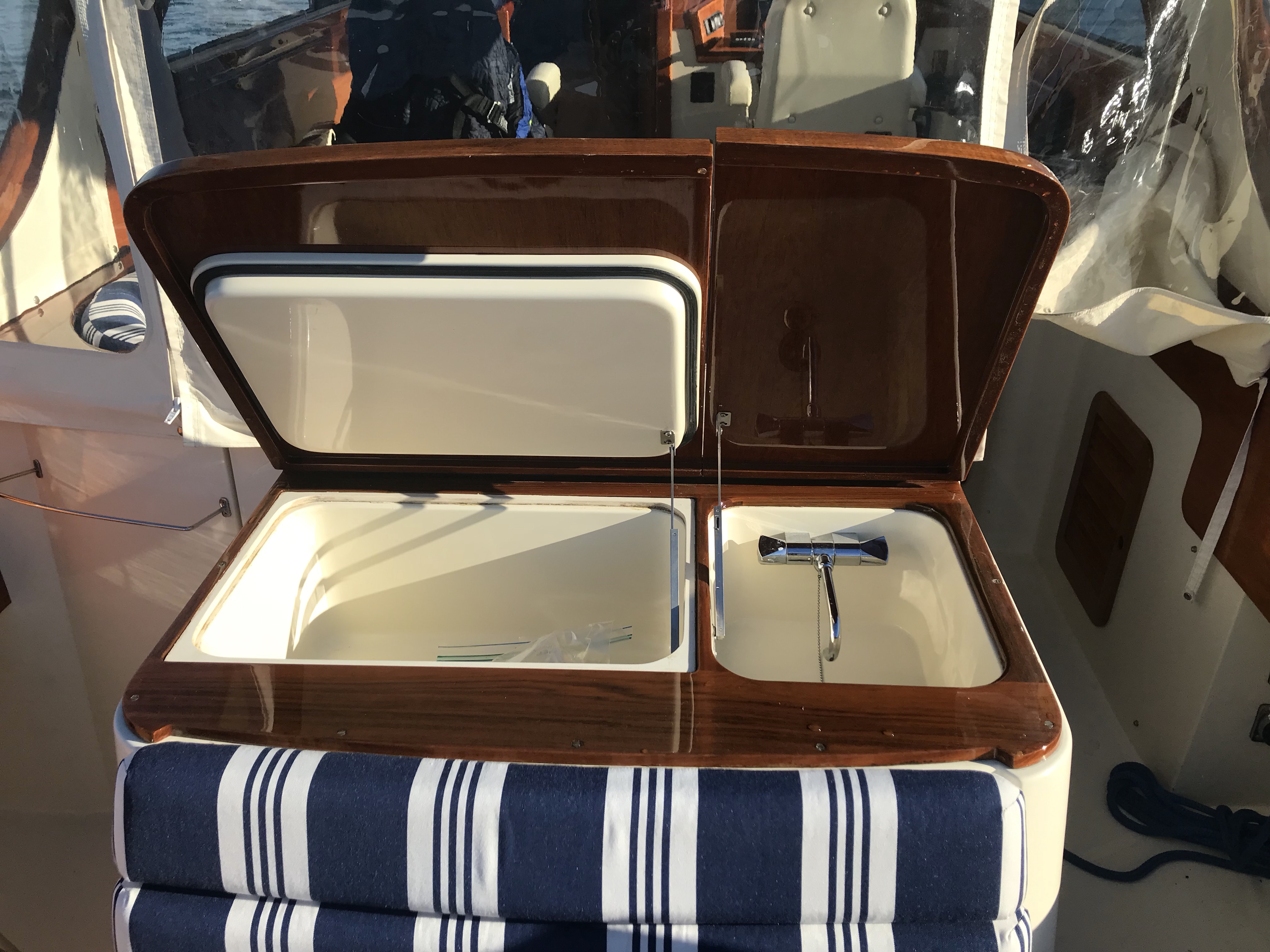 The boat has reasonable accommodations for its purpose (a “picnic boat”). There is a galley below deck with a refrigerator, a propane cooktop and a microwave. Above deck is a gas grill, cooler and sink with hot/cold water. There is also a head with a sink, toilet and hand held shower. A V-berth provides sleeping, or napping, accommodations for two in the forward cabin. The pilot house and cabin have heating and cooling so the season is extended, mostly by the heating capability.