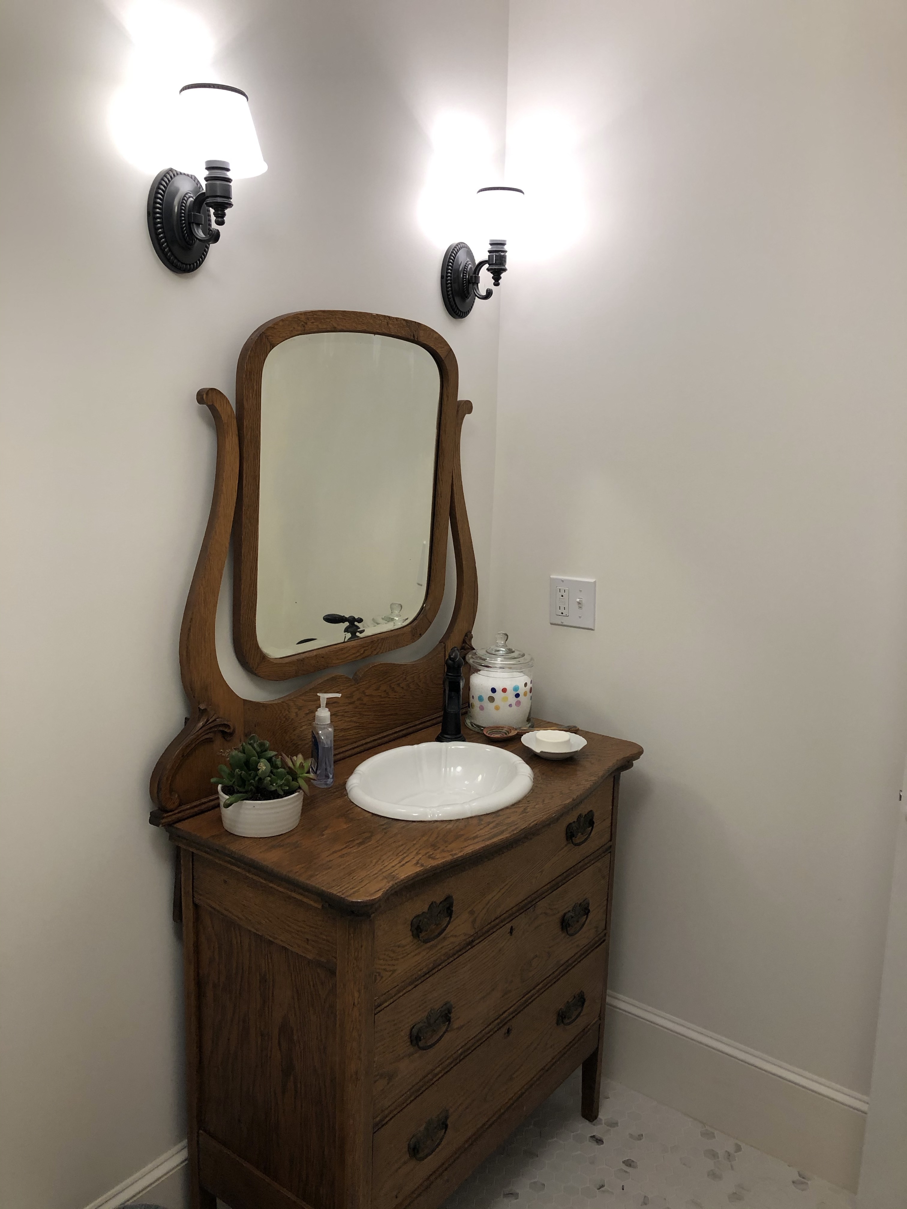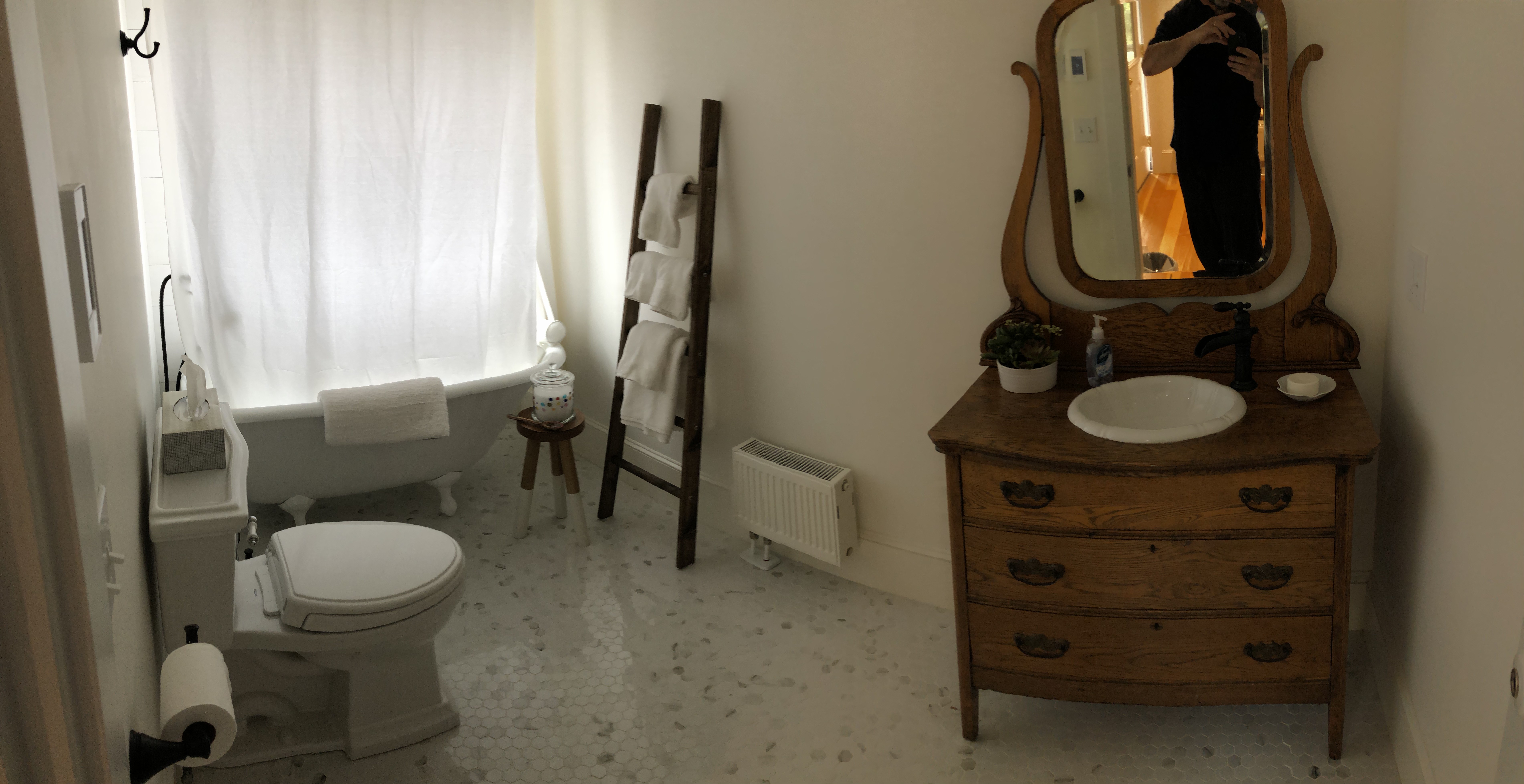 Panoramic view of bathroom showing tub, sink and layout.Tub and towel "ladder".Sink base made from quasi-antique bureau.