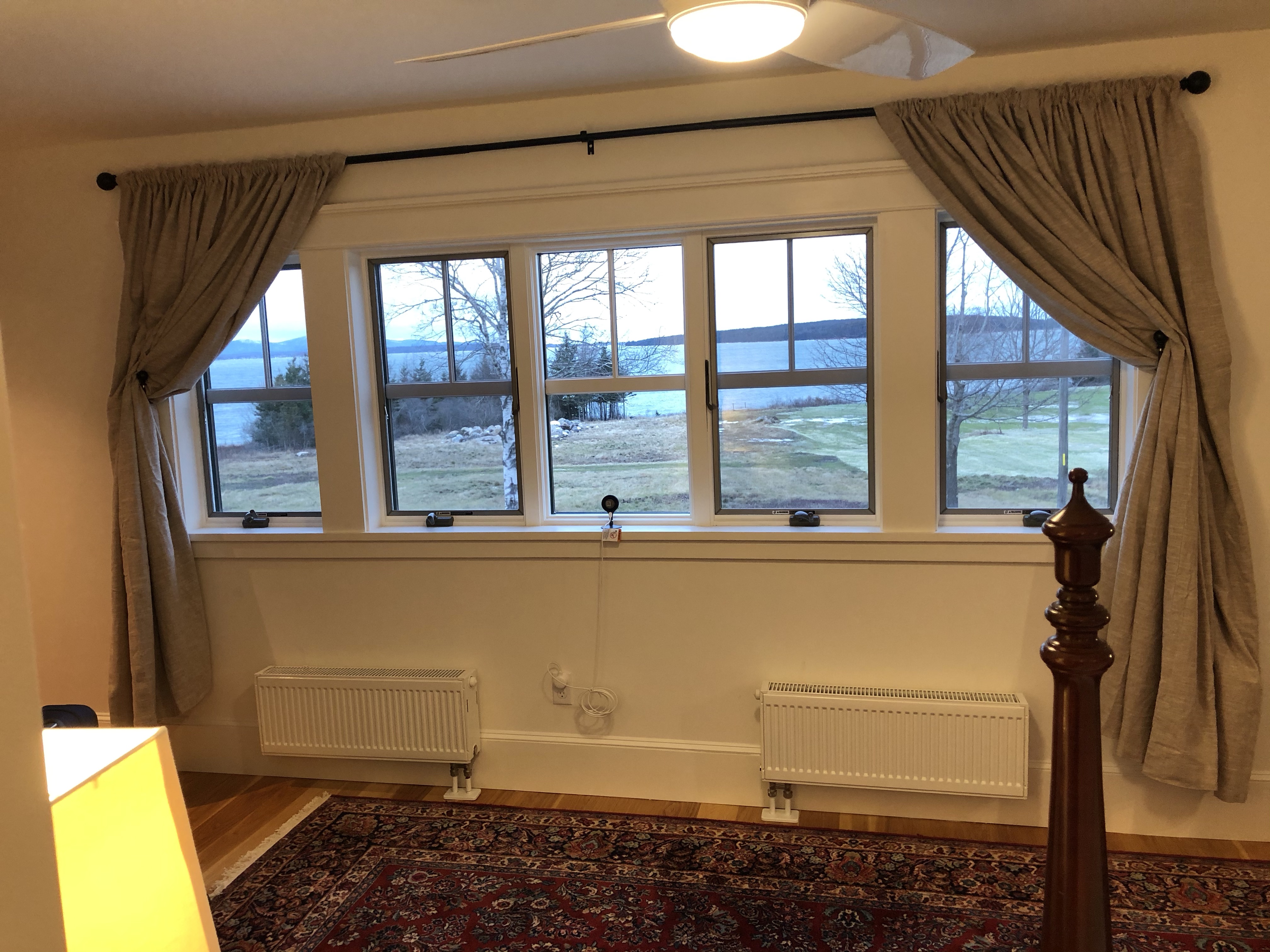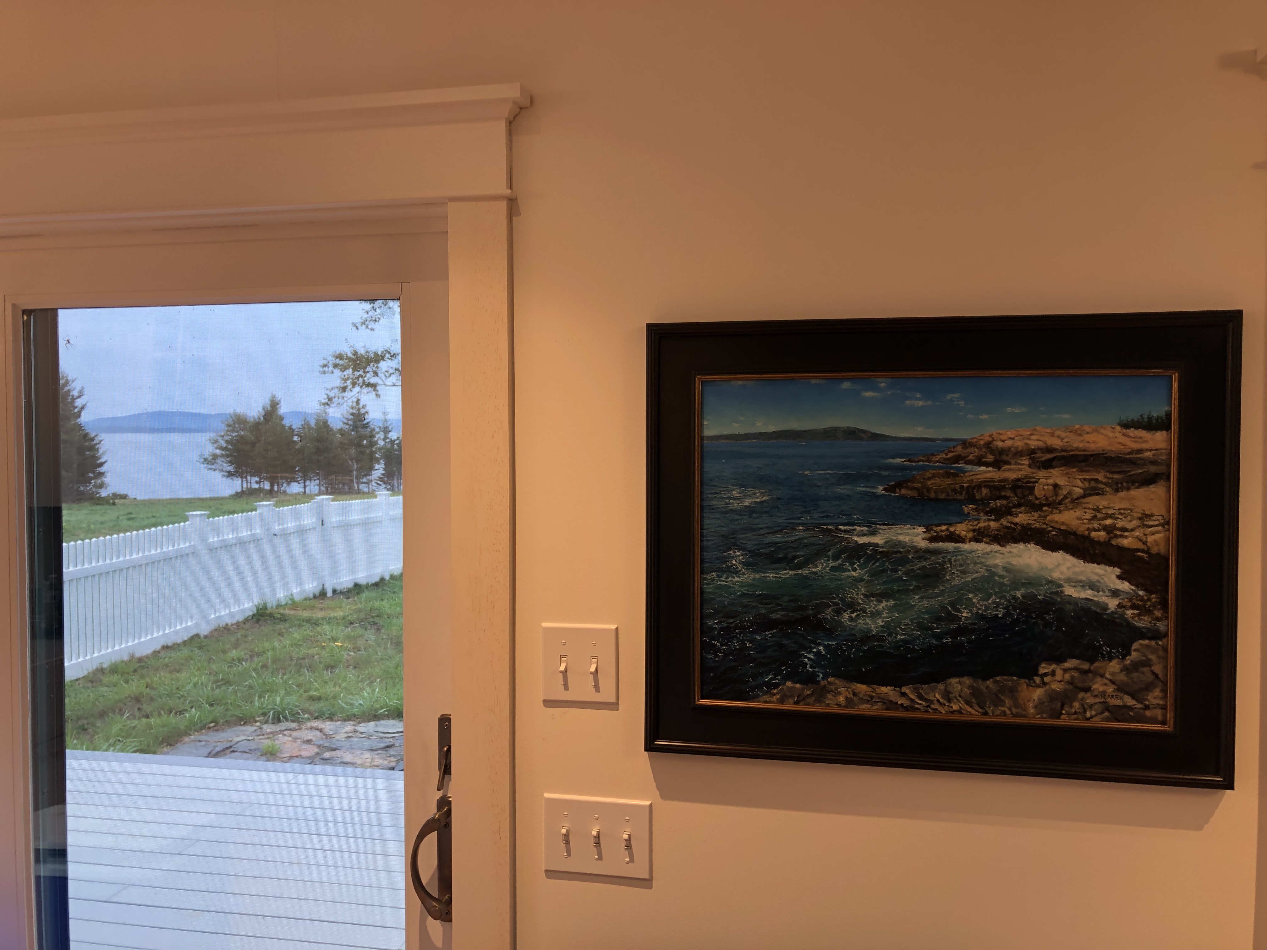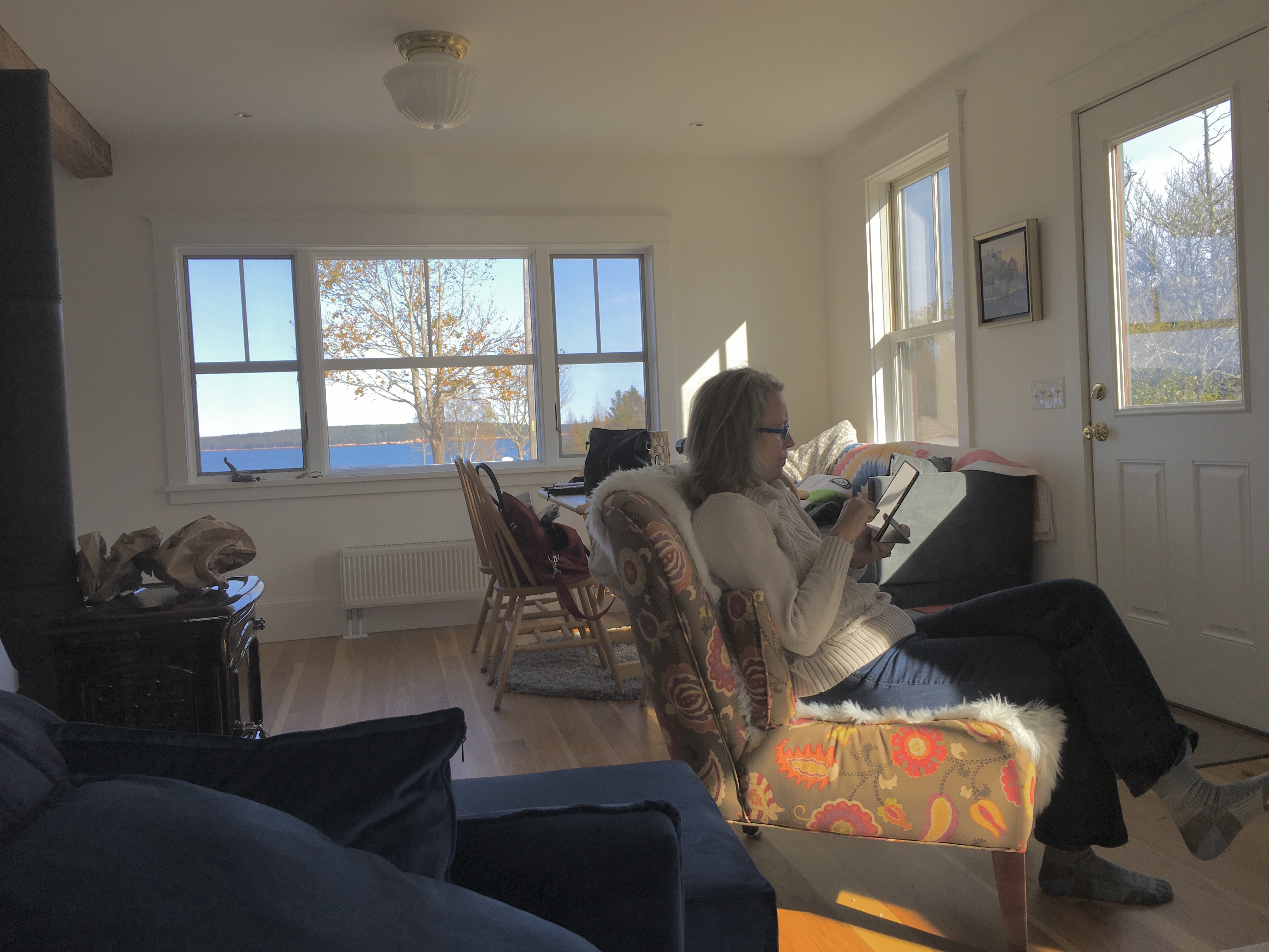 Evening view of living room sitting area.View from sitting area out back window to Eastern Passage, Placentia island and mountains of Acadia.Bookcase has a variety of books about coastal Maine history, trail guides and history for Acadia National Park as well as a small selection of board games, puzzles and a Lego Ducati V4R kitPorsche 911 RSR for rainy days.This hutch solves some of our limited storage. If you can't find something, check in here.Mix of art and function with a 65" OLED TV framed by an ash table from the artist Gail Fredell, entitled Spud Point. Woodstove in use. It doesn't take much wood to heat the place.....