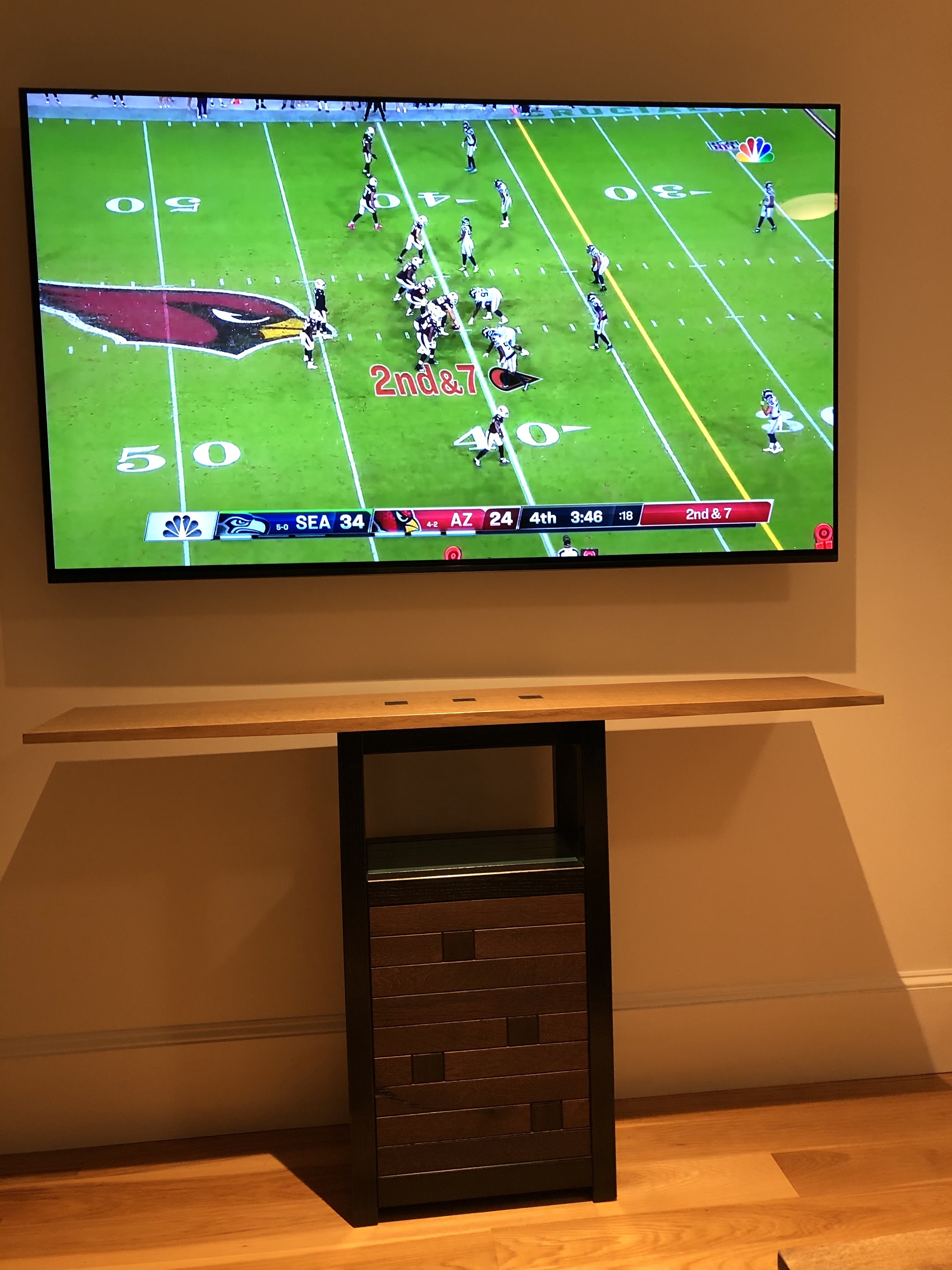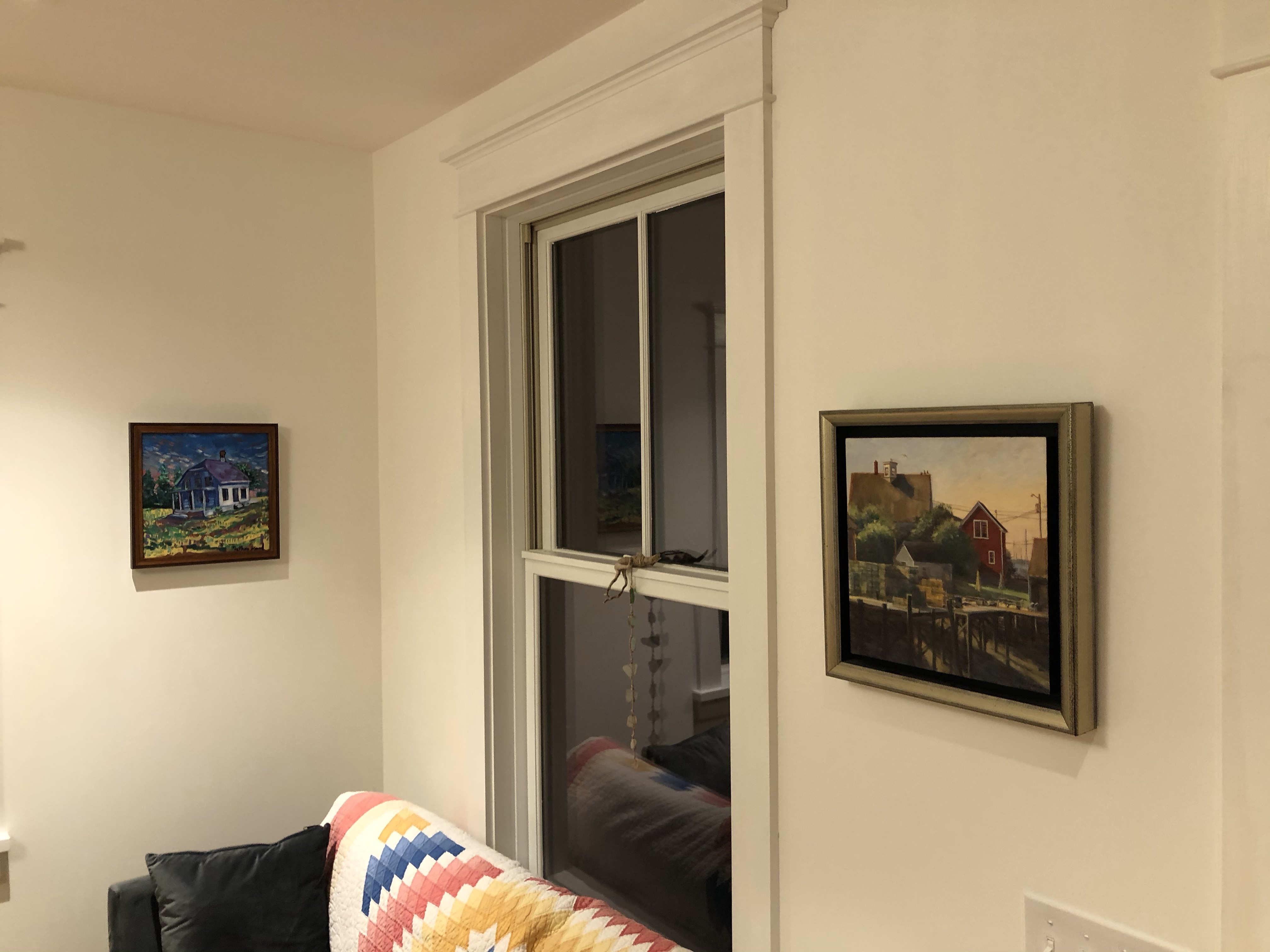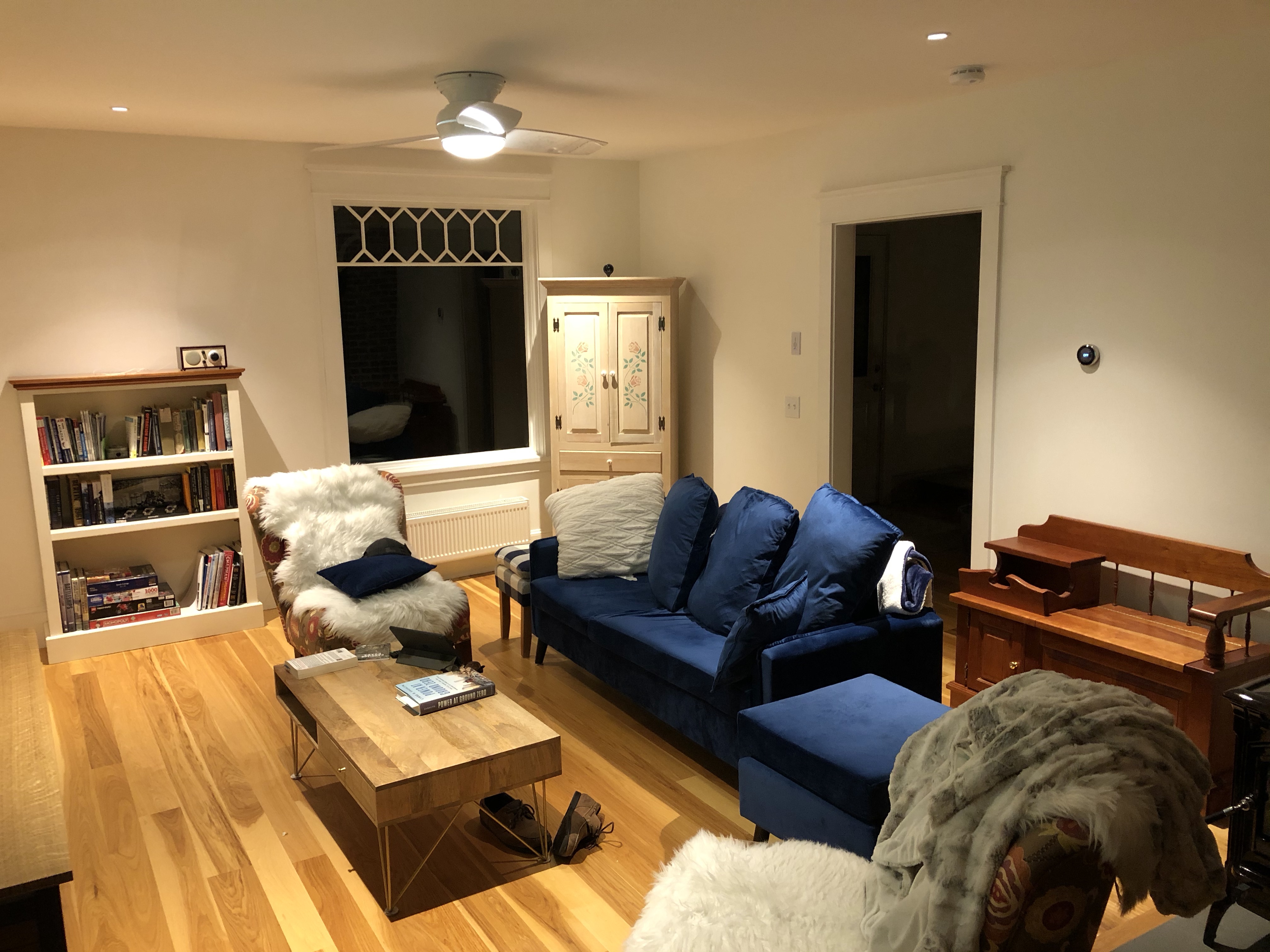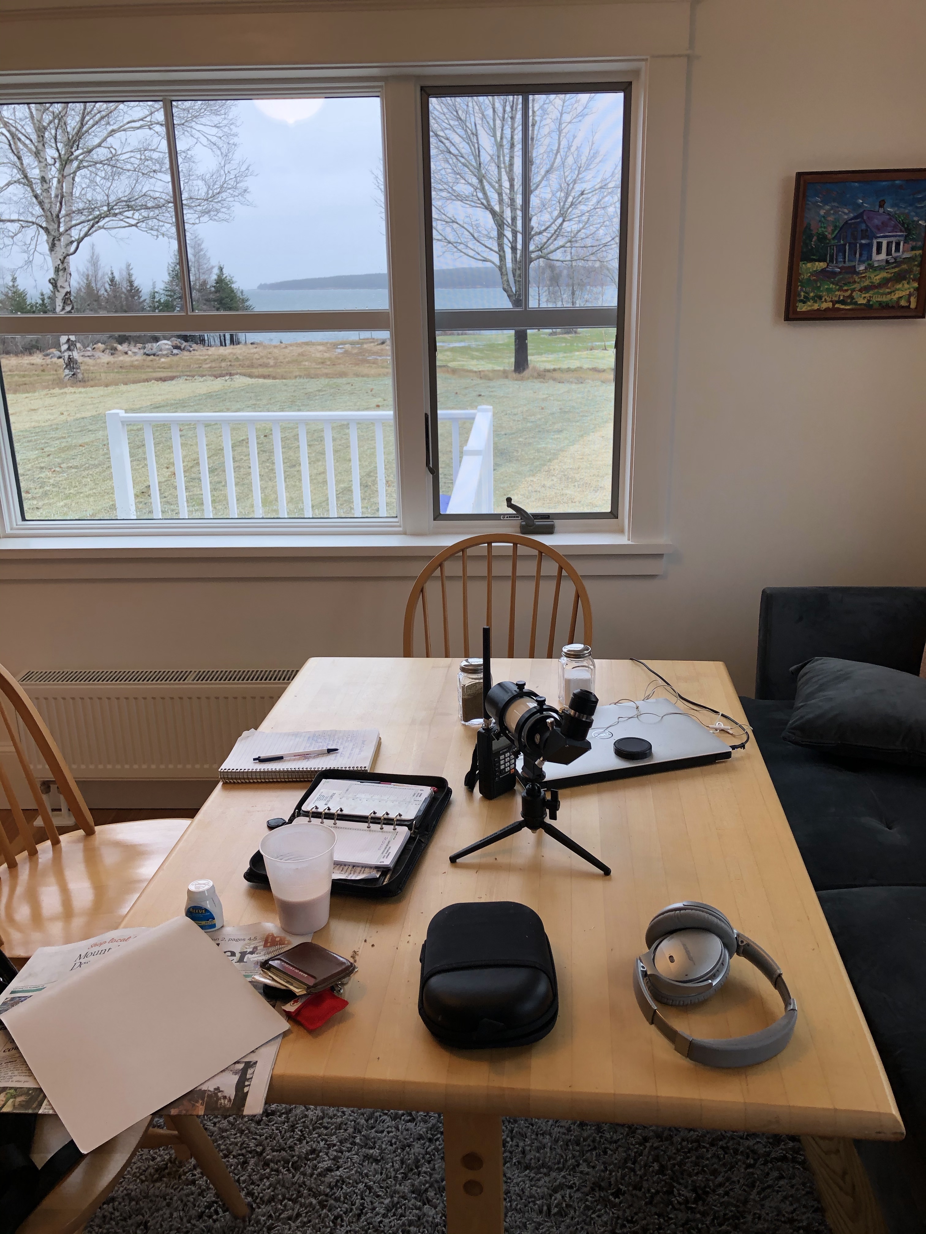 Evening view of living room sitting area.View from sitting area out back window to Eastern Passage, Placentia island and mountains of Acadia.Bookcase has a variety of books about coastal Maine history, trail guides and history for Acadia National Park as well as a small selection of board games, puzzles and a Lego Ducati V4R kitPorsche 911 RSR for rainy days.This hutch solves some of our limited storage. If you can't find something, check in here.Mix of art and function with a 65" OLED TV framed by an ash table from the artist Gail Fredell, entitled Spud Point. Woodstove in use. It doesn't take much wood to heat the place.....