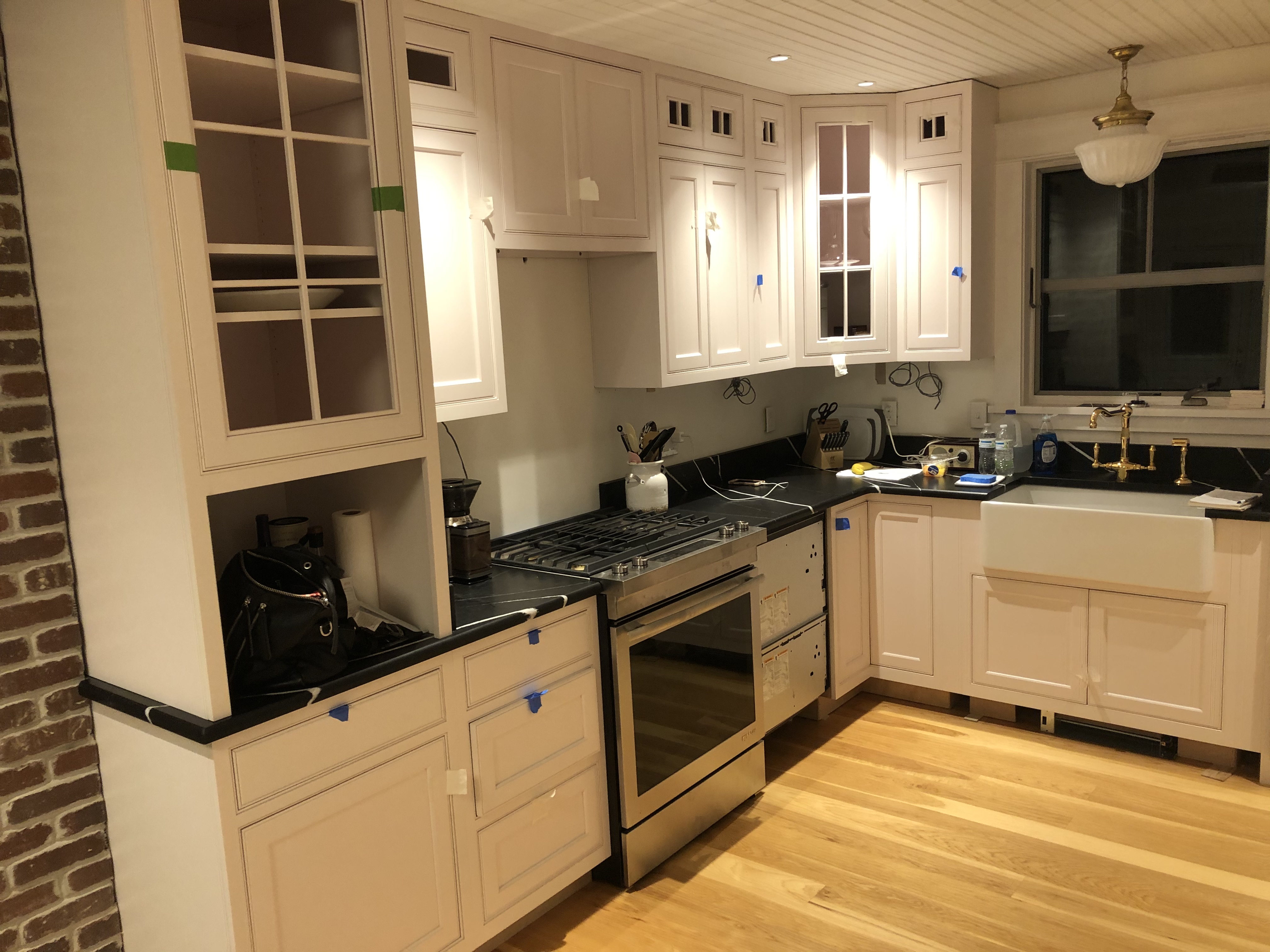 Cabinets, counters, range, dishwashing drawers and sink all in and functional.Updated view with microwave installed and panels on refrigerator and dishwasher drawers.