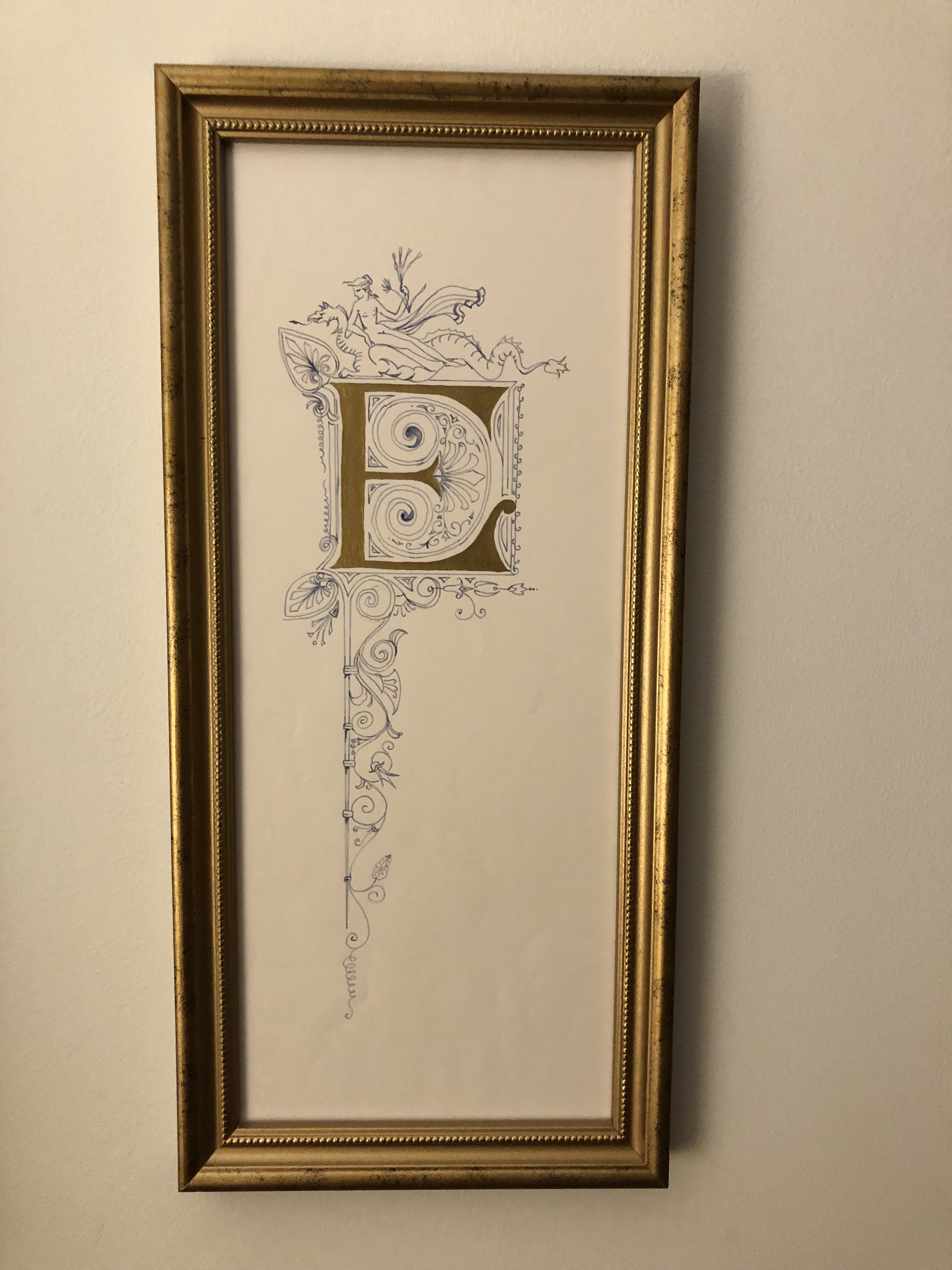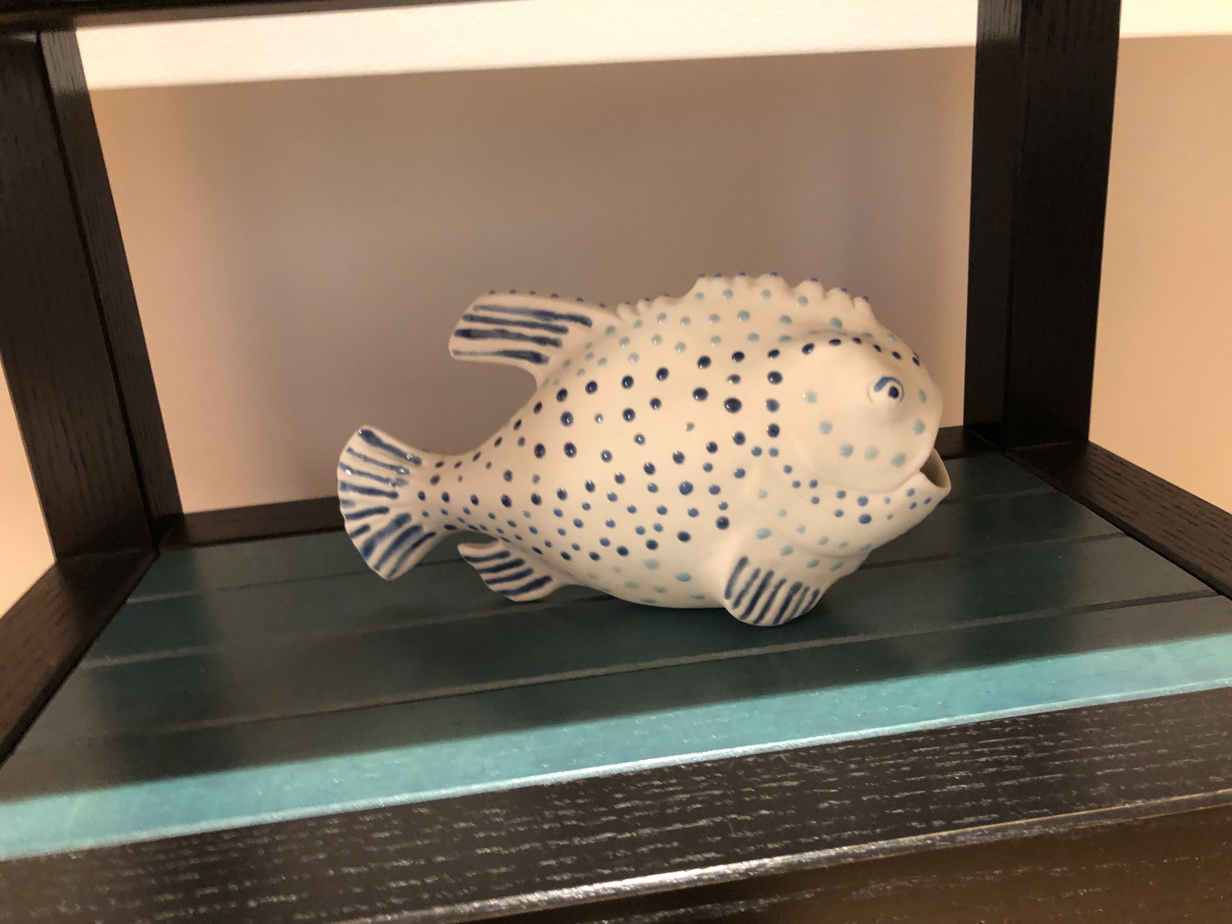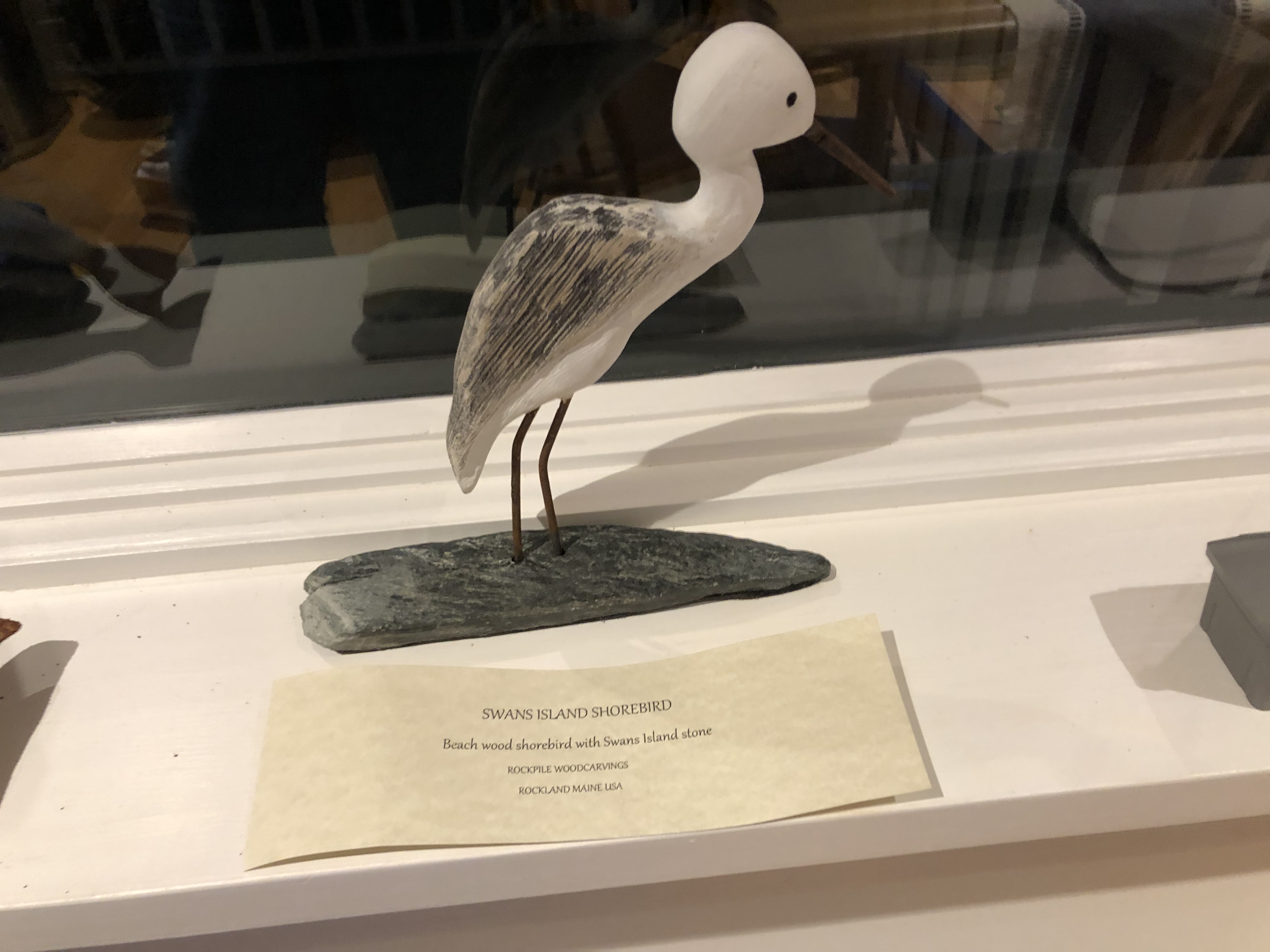 1904 topography map of Swan's Island.Mermaid by island artist Laurel Lemoine.Lumpfish glazed porcelain by local artist Christine Dentremont.Original watercolor of Swan's Island coastline.Whale carved by Jerry Sytsma from cap rail of schooner Boyd N. Sheppard with stone base from beach of Swan's Island.Shorebird carved fron beach wood by Jerry Sytsma, with stone base fron Swan's Island.Calligraphy "E" by local artist Laurel Lemoine.Bronze bust of Joshua Chamberlain, Colonel and commander of 20th Maine Regiment at the battle of Gettysburg, Governor of Maine (1866-70).1/700 scale model of British battleship Prince of Wales, December 1941.Wooden model of a Hudson river sloop built as a child by Ephraim Dobbins, circa 1970, and sailed in the Central Park boat pond.Original lithograph of Mt. Desert Rock. Wooden toy tug boat made by Robert Dobbins, circa mid 1960's.