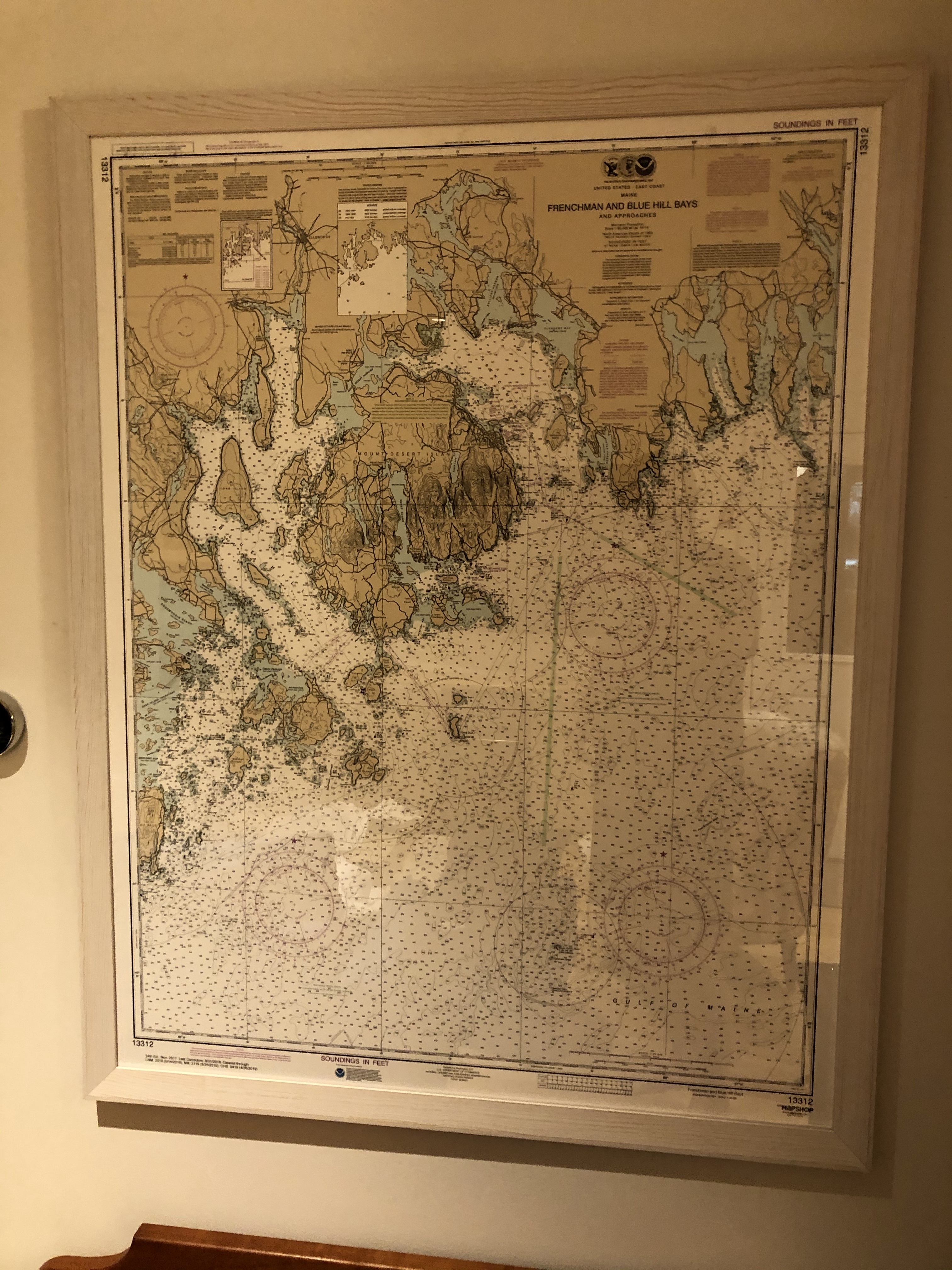 Painting on left is original oil by Nathan Ward of the Cloud House. The painting on the right is an original oil of Port Clyde waterfront from Somesville gallery. An original oil painting of Schoodic Point by Mary Jo Carew. Painting on left is original oil by Nathan Ward of the Cloud House. The painting on the right is an original oil of Port Clyde waterfront from Somesville gallery. Flag flown from Robert Dobbins' sloop Revenge, a 28' sailboat, on his transatlantic voyage in 1985. Half model is of the same boat.More reference than art, This is a nautical map of the area surrounding Swan's Island and an excellent starting point for contempating off island destinations.