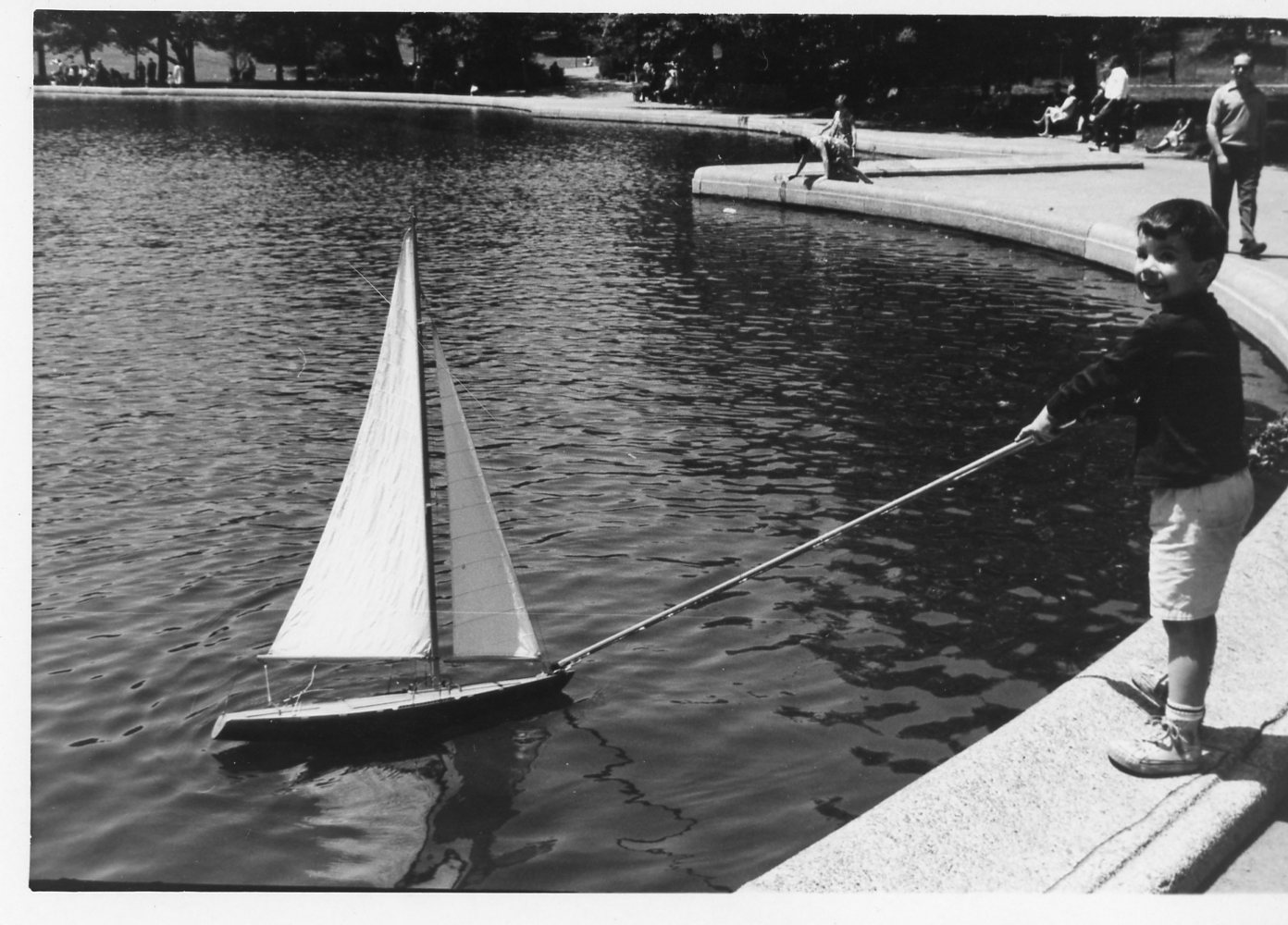 Restored family heirloom, "pond yacht", Paralus with print of Central Park model boat pond in the background, where it was sailed.Entryway chandelier. Evocative of an sundial, with the arrow pointing north.