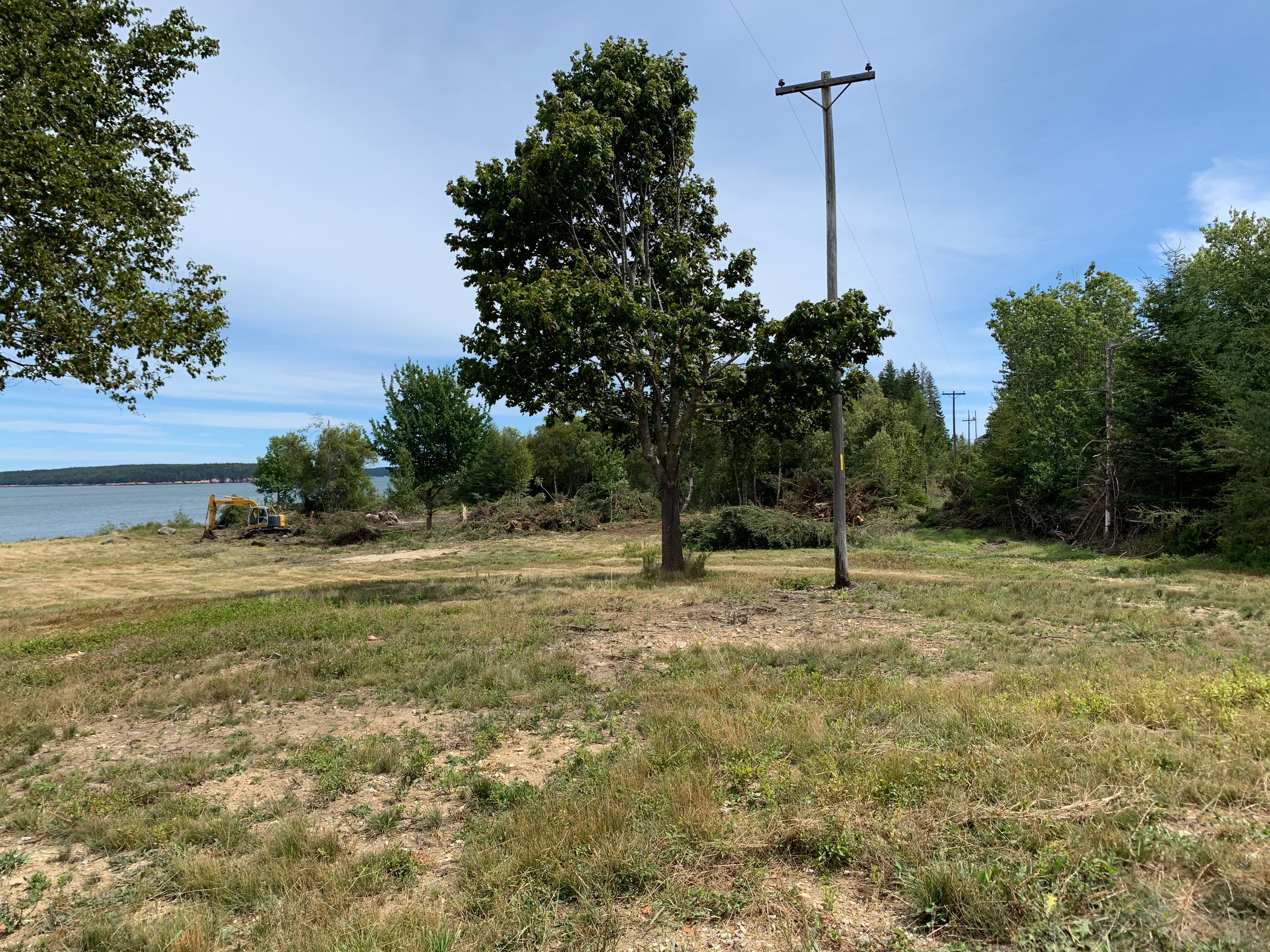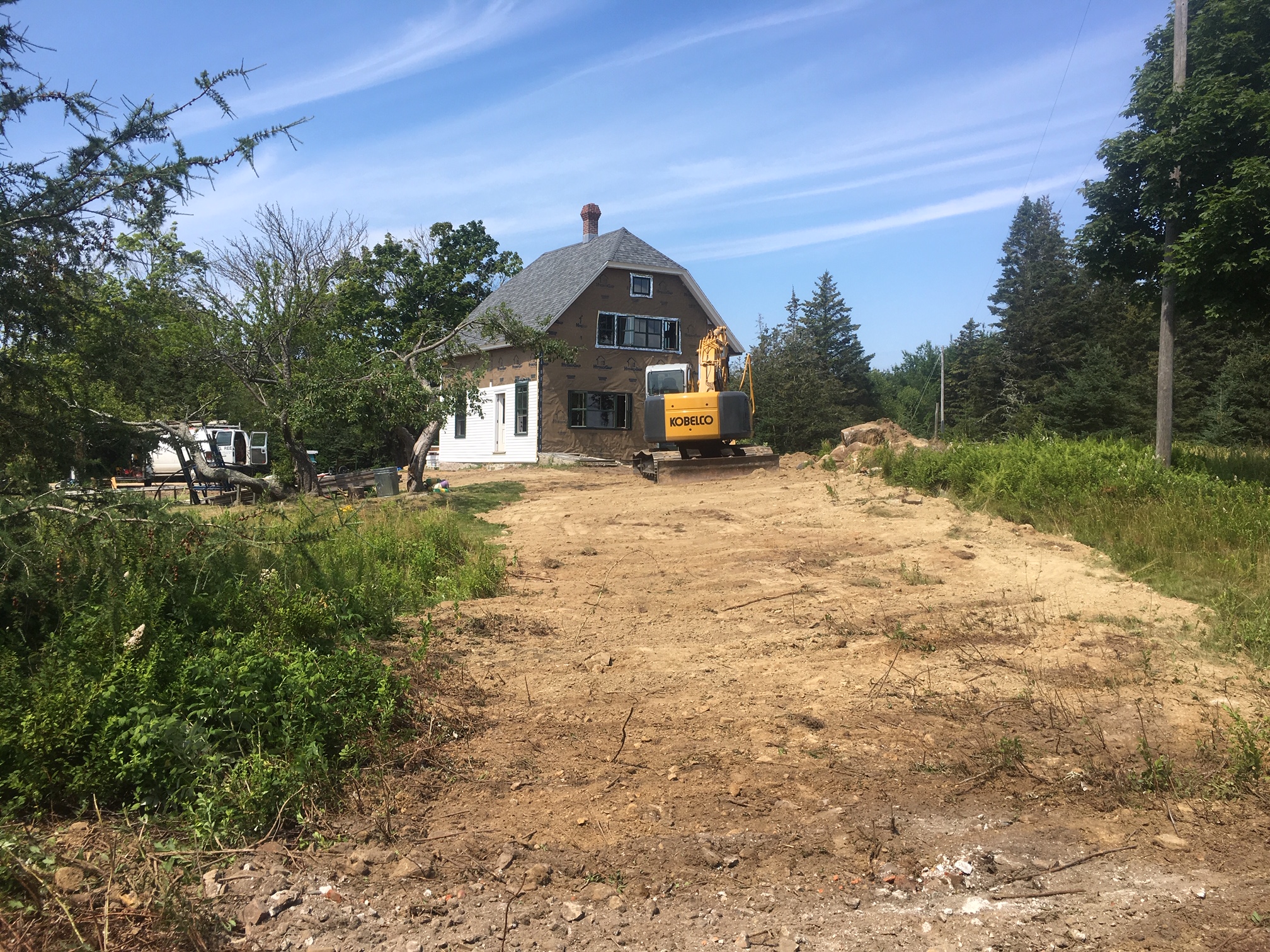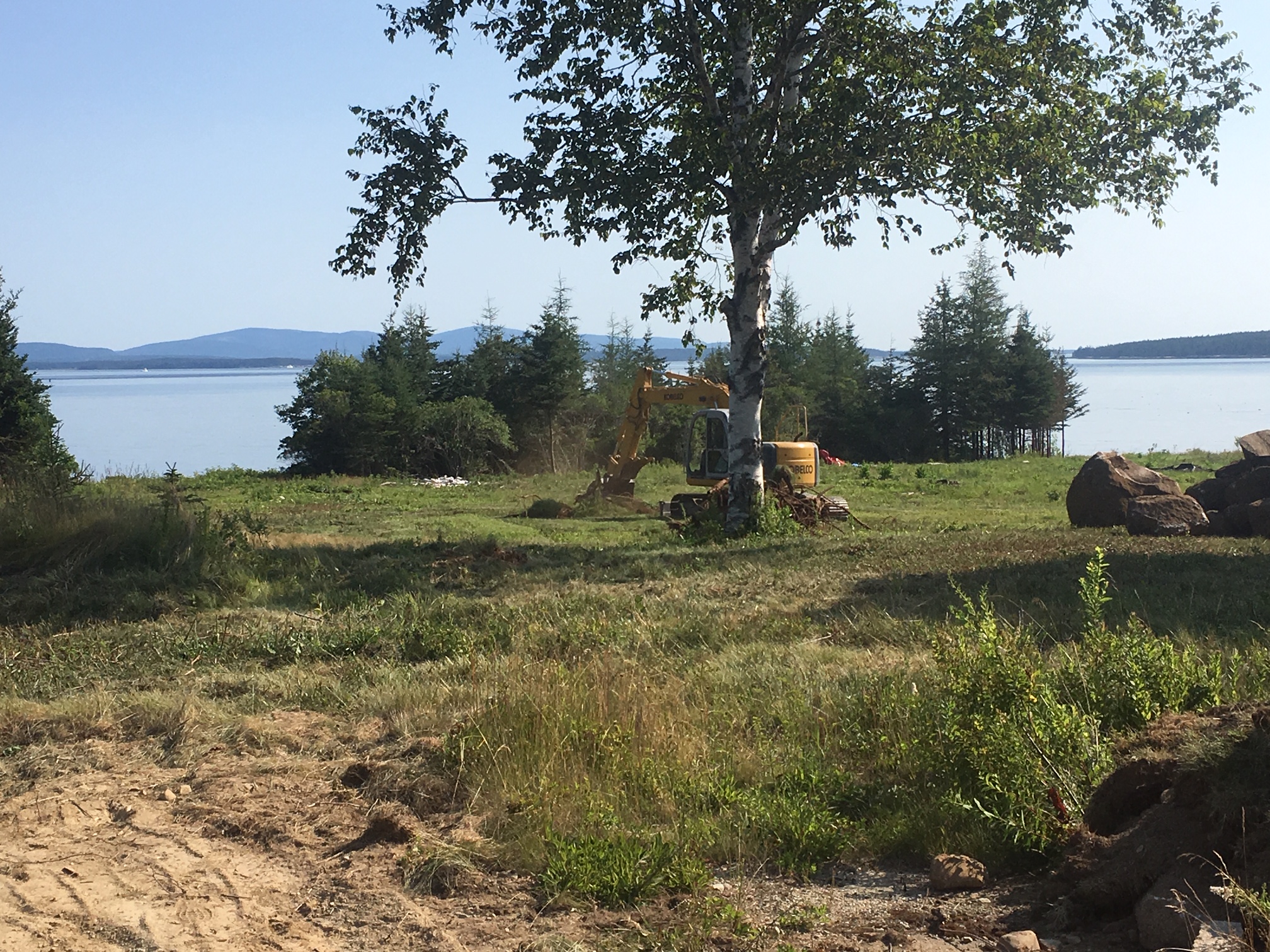 Clearing out spruce trees, leaving hardwoods.Hauling out the spruces.View to the water with grading done.View back to house with grading done.Pulling stumps and moving boulders. The wonders of hydraulics!Finished laying drain pipe from corner of basement to low spot in side woods. No need for sump pump now!Driveway renewal.Post clearing view in JuneBrush burningBrush chippingTrees coming down!Scorched earth clearing.View of Acadia mountainsView from deck, prominent birch treeAlong the "beach"